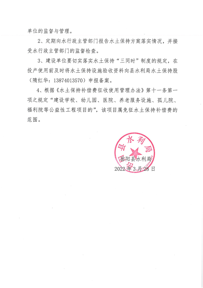 岳阳县水利局关于同意《岳阳县张谷英镇中心学校公租房安置小区配套基础设施建设项目水土保持方案报告表》的批复