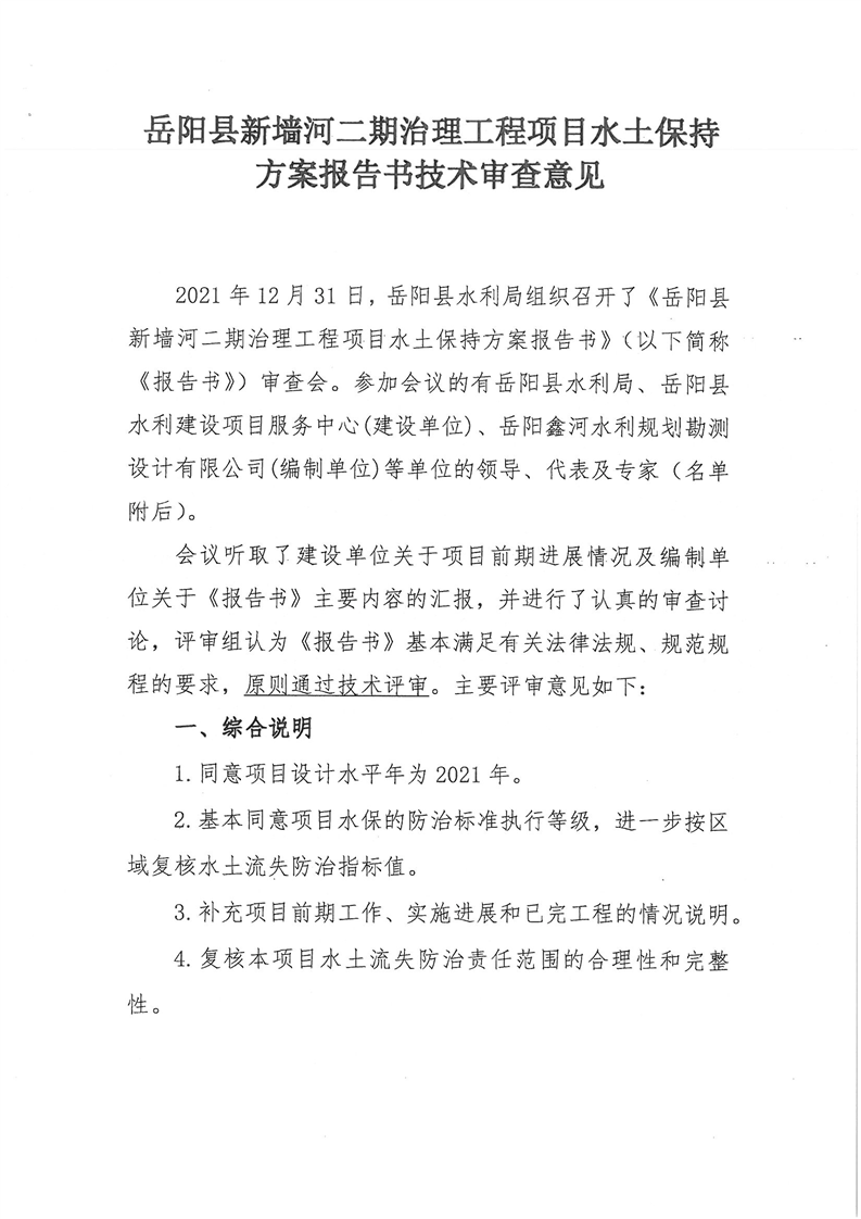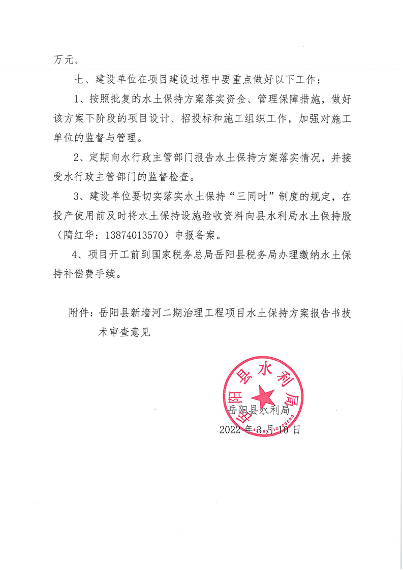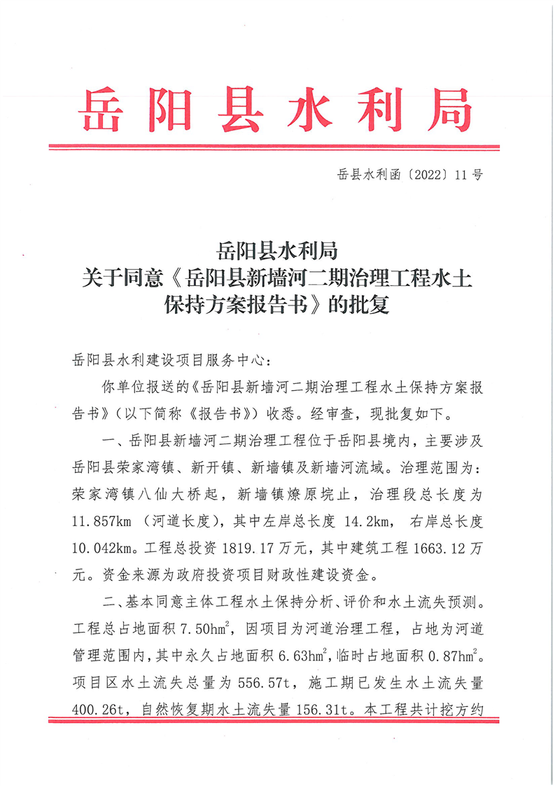 岳阳县水利局关于同意《岳阳县新墙河二期治理工程水土保持方案报告书》的批复