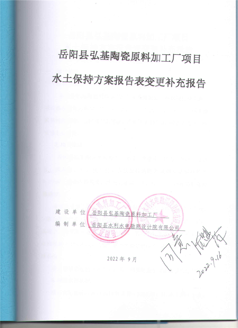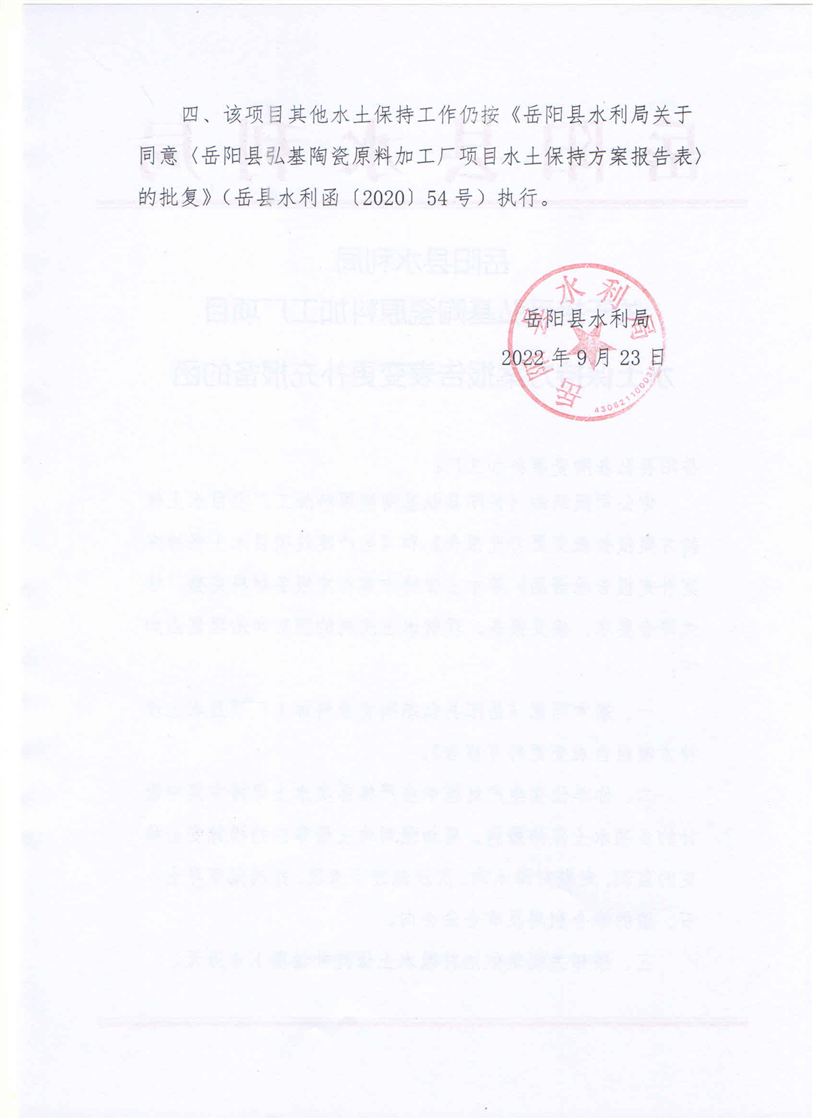 岳阳县水利局关于接受弘基陶瓷原料加工厂项目水土保持方案报告表变更补充报备的函