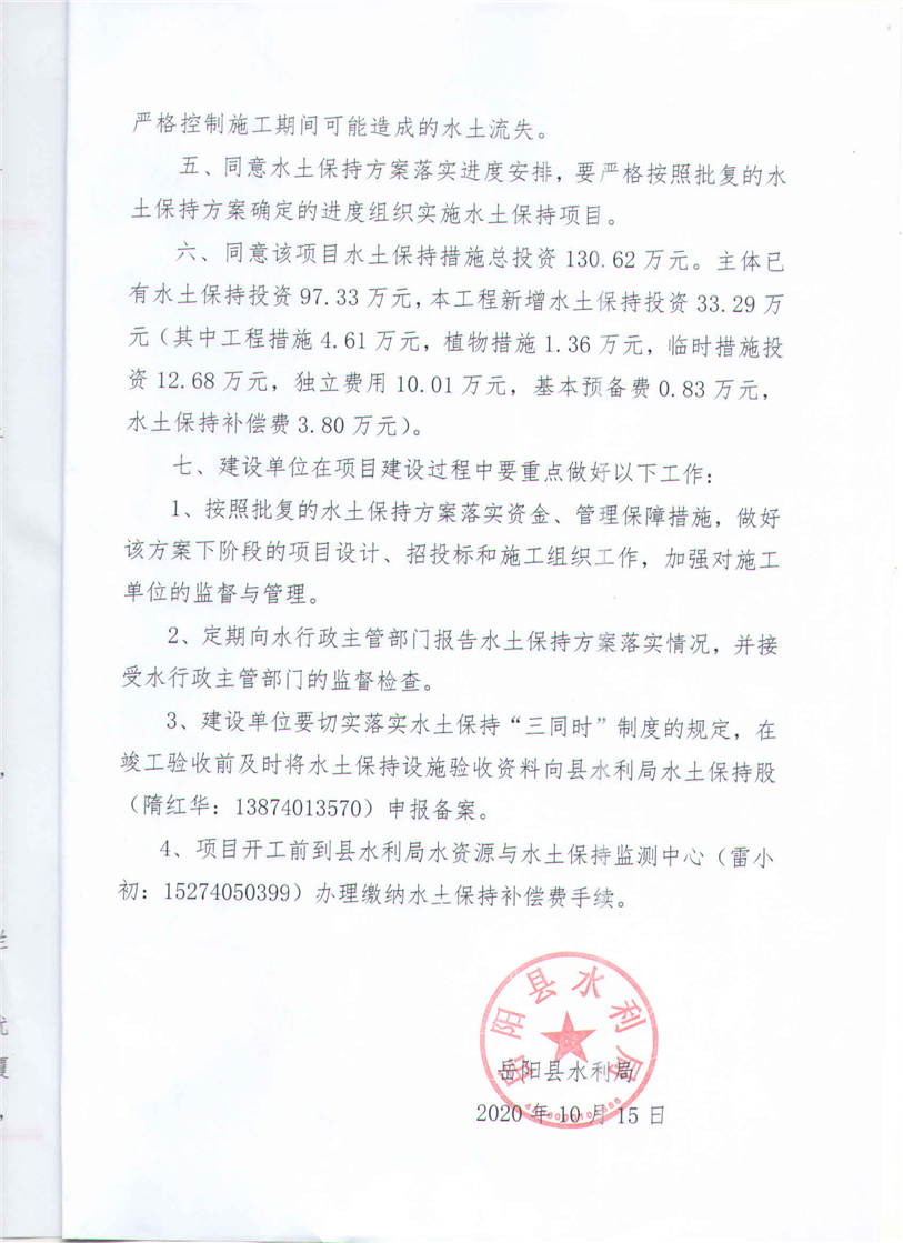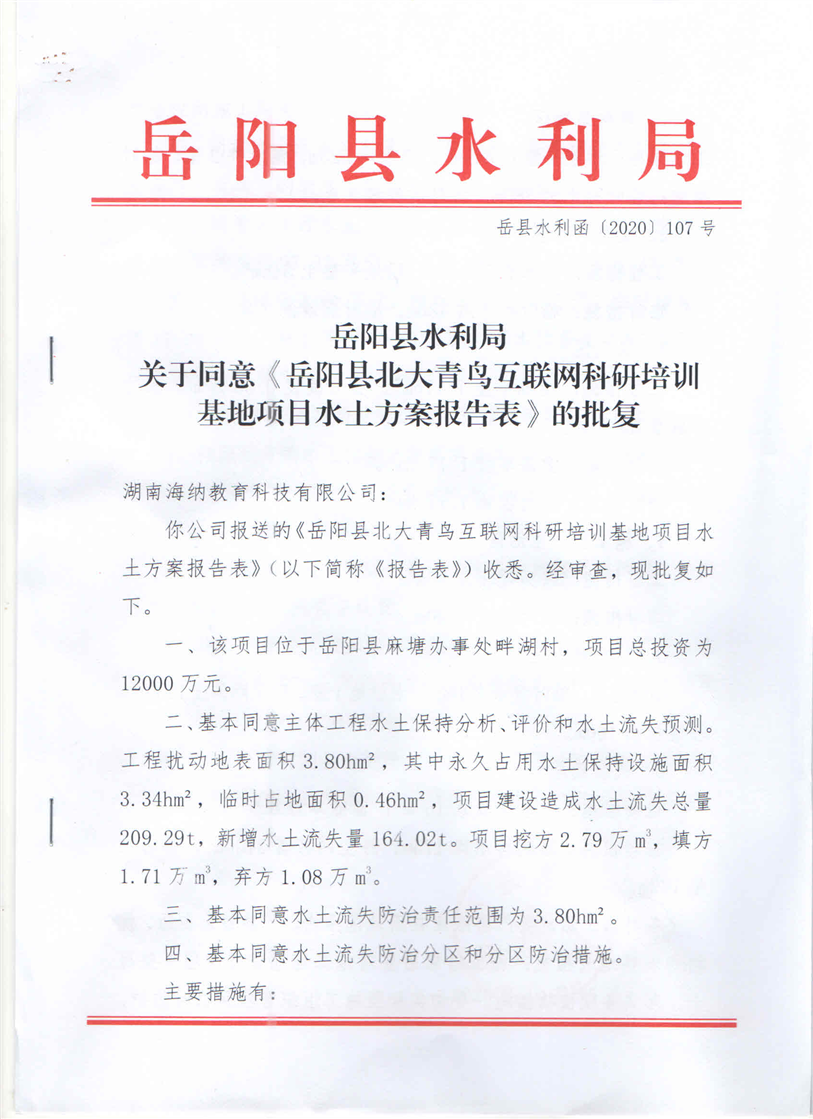 岳阳县水利局关于同意《岳阳县北大青鸟互联网科研培训基地项目水土保持方案报告表》的批复