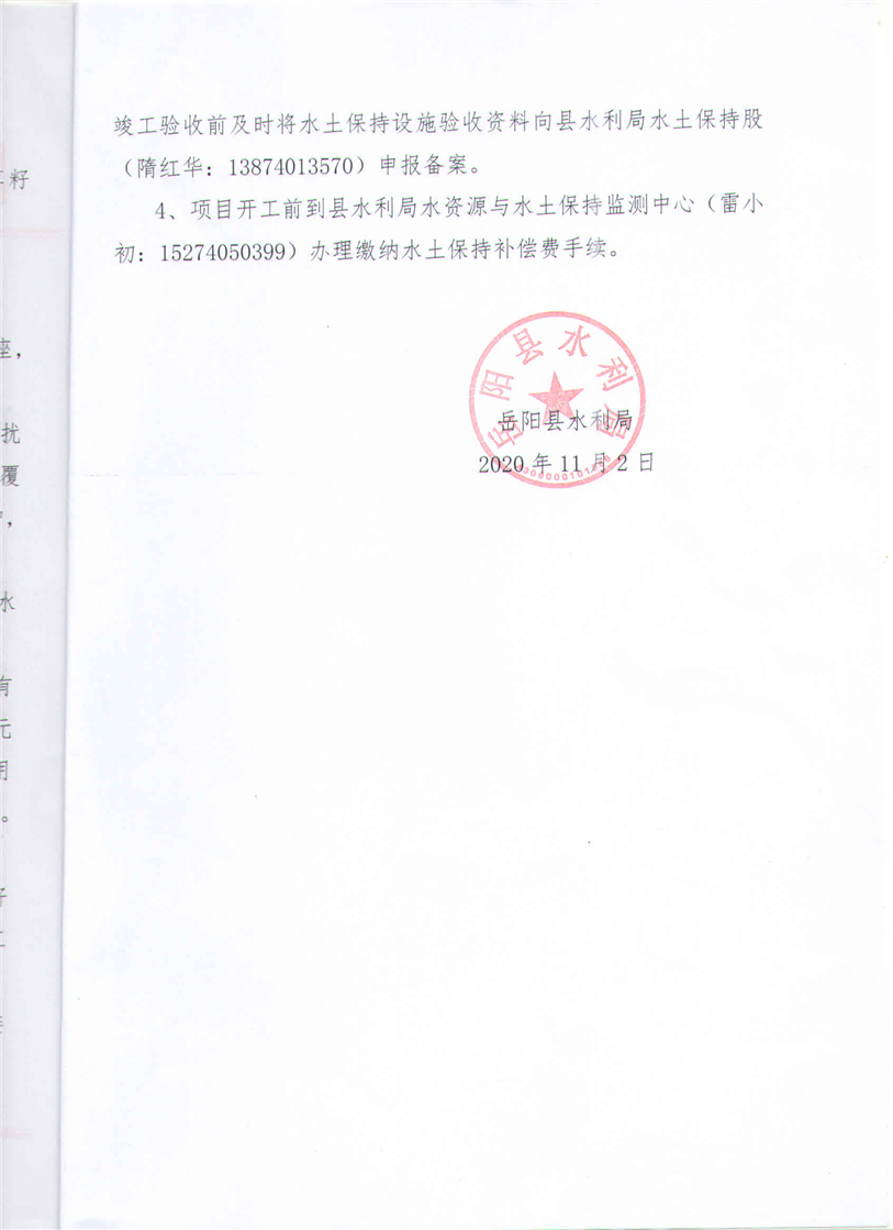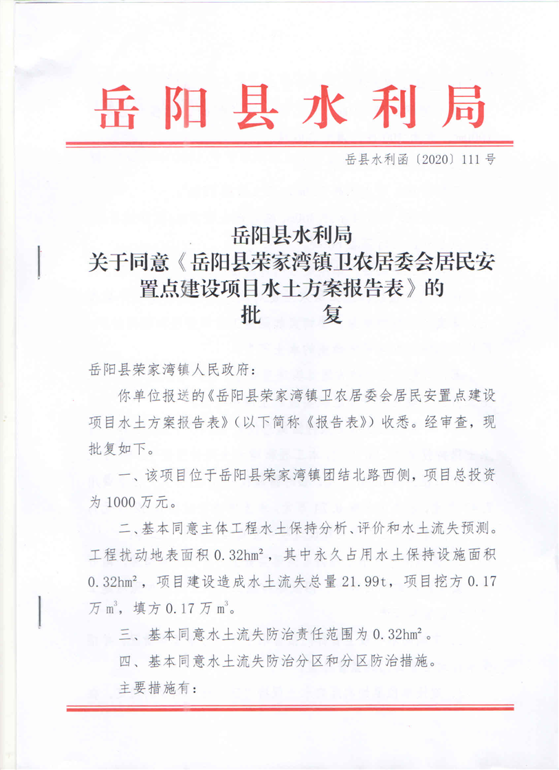 岳阳县水利局关于同意《岳阳县荣家湾镇卫农居委会居民安置点建设项目水土保持方案报告表》的批复