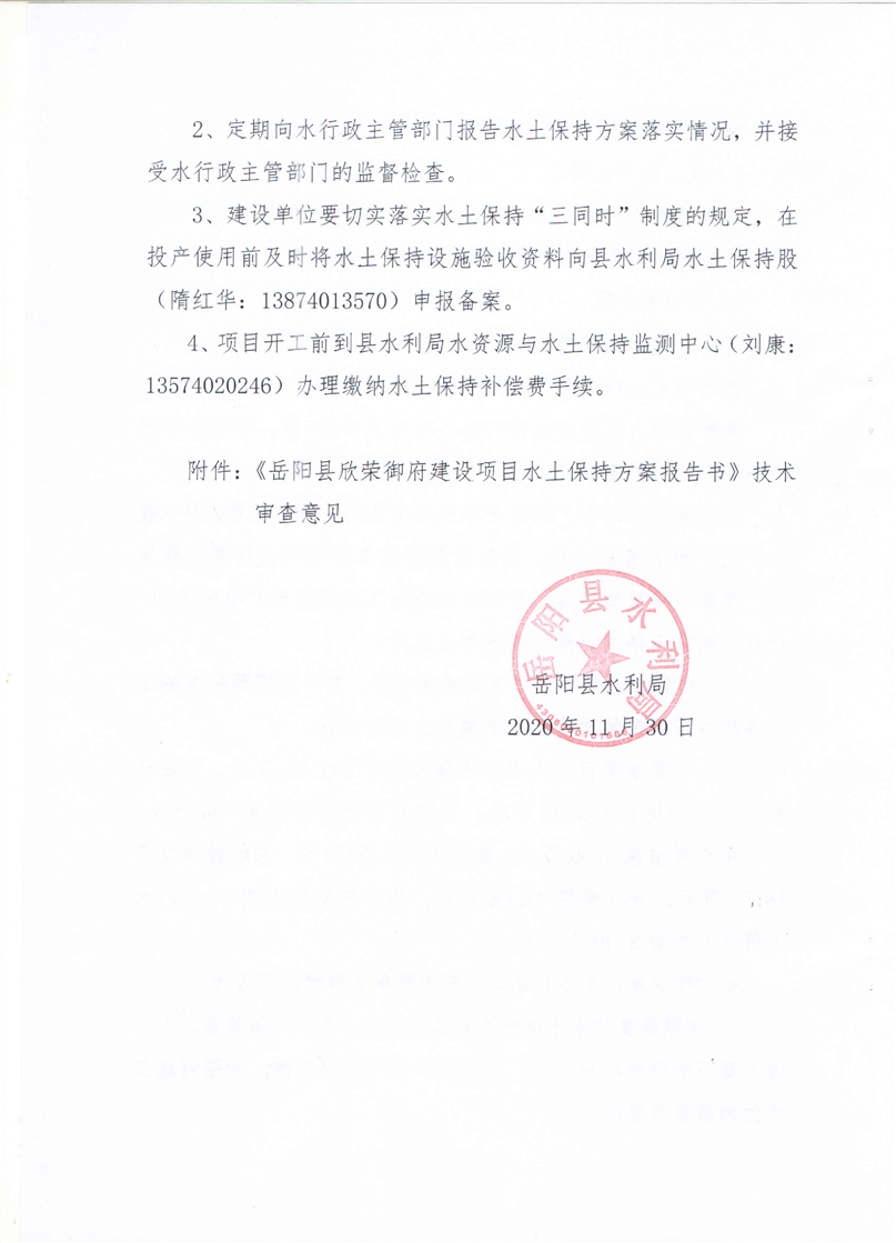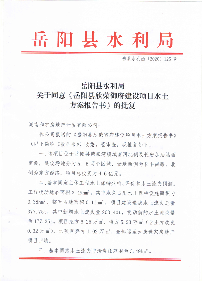 岳阳县水利局关于同意《岳阳县欣荣御府建设项目水土保持方案报告书》的批复