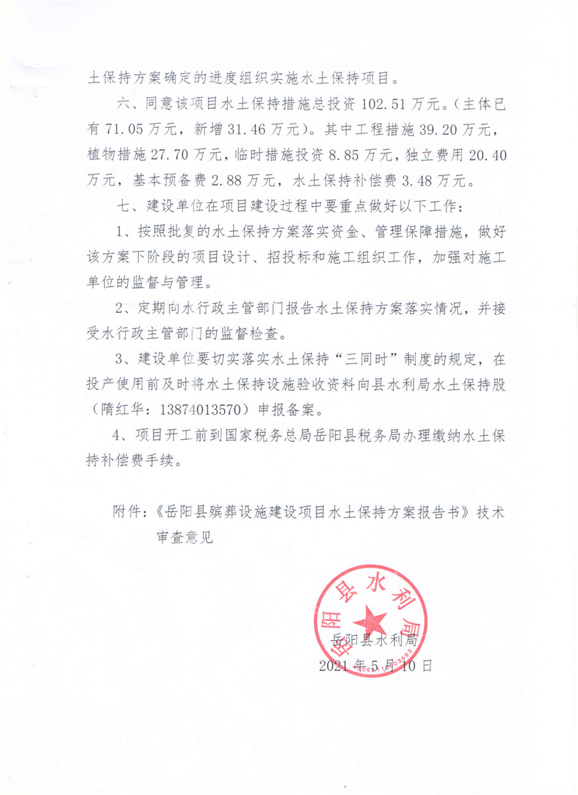岳阳县水利局关于同意《岳阳县殡葬设施建设项目水土保持方案报告书》的批复