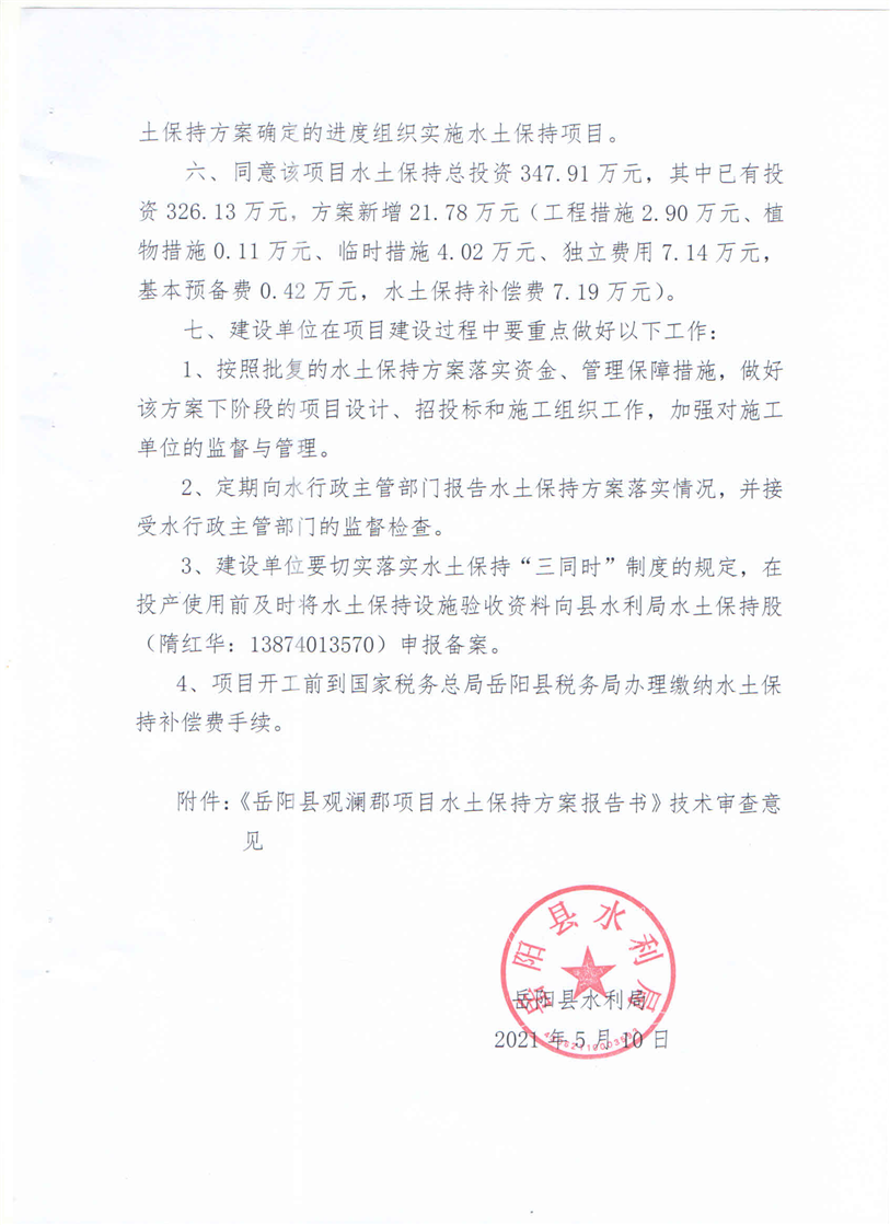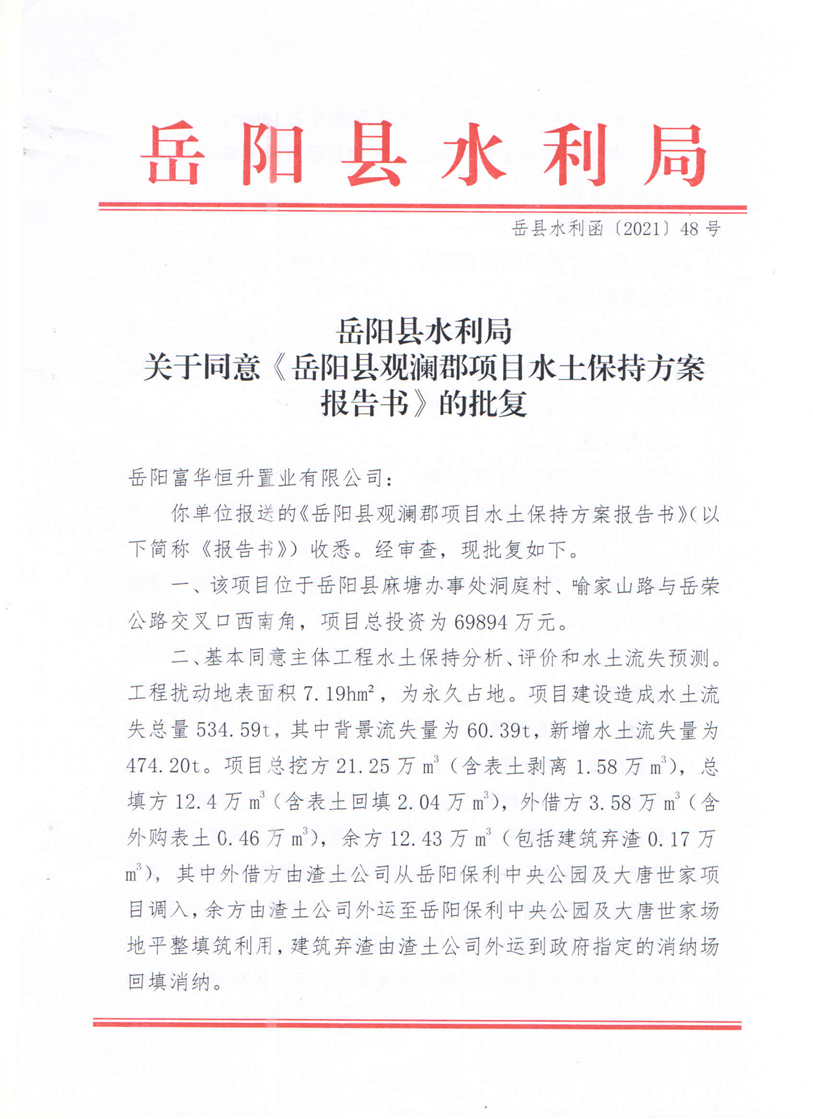 岳阳县水利局关于同意《岳阳县观澜郡项目水土保持方案报告书》的批复