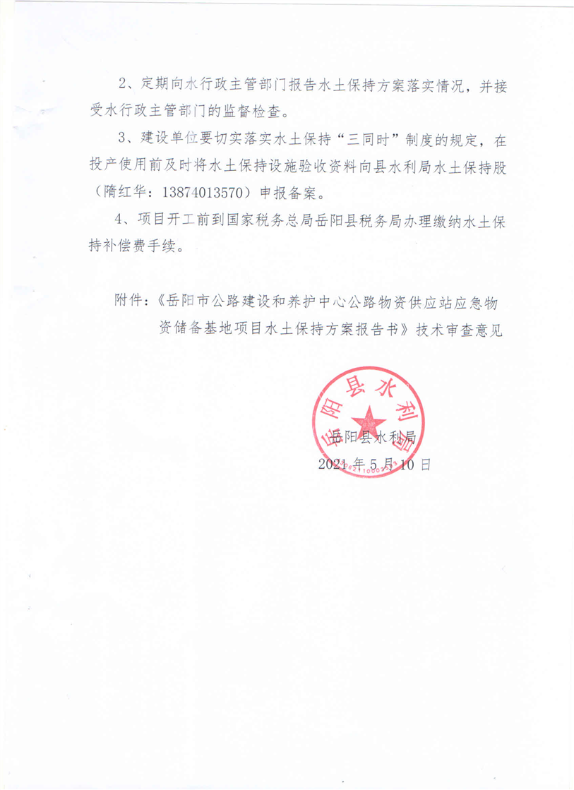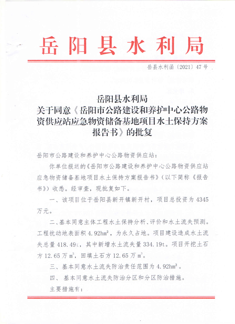 岳阳县水利局关于同意《岳阳市公路建设和养护中心公路物资供应站应急物资储备基地项目水土保持方案报告书》的批复