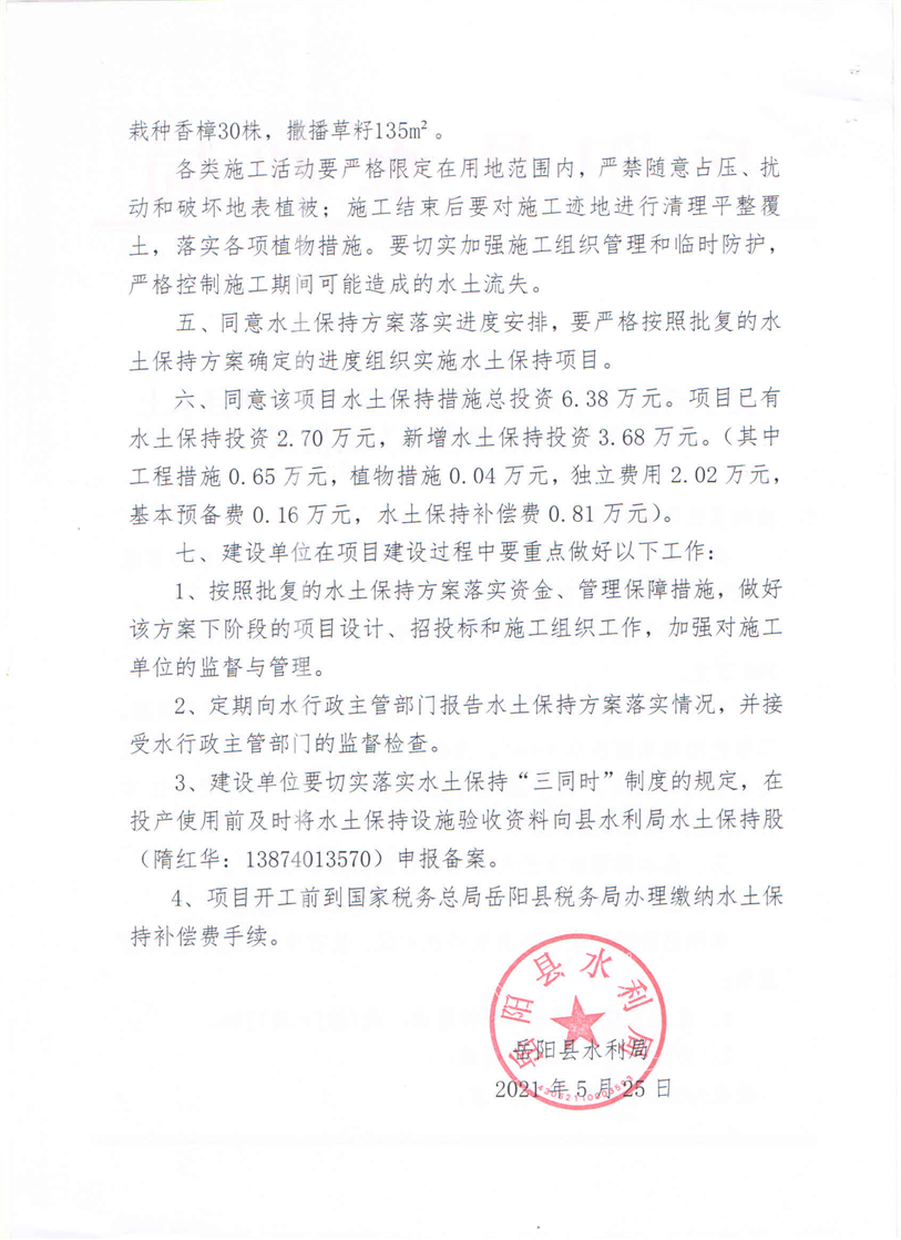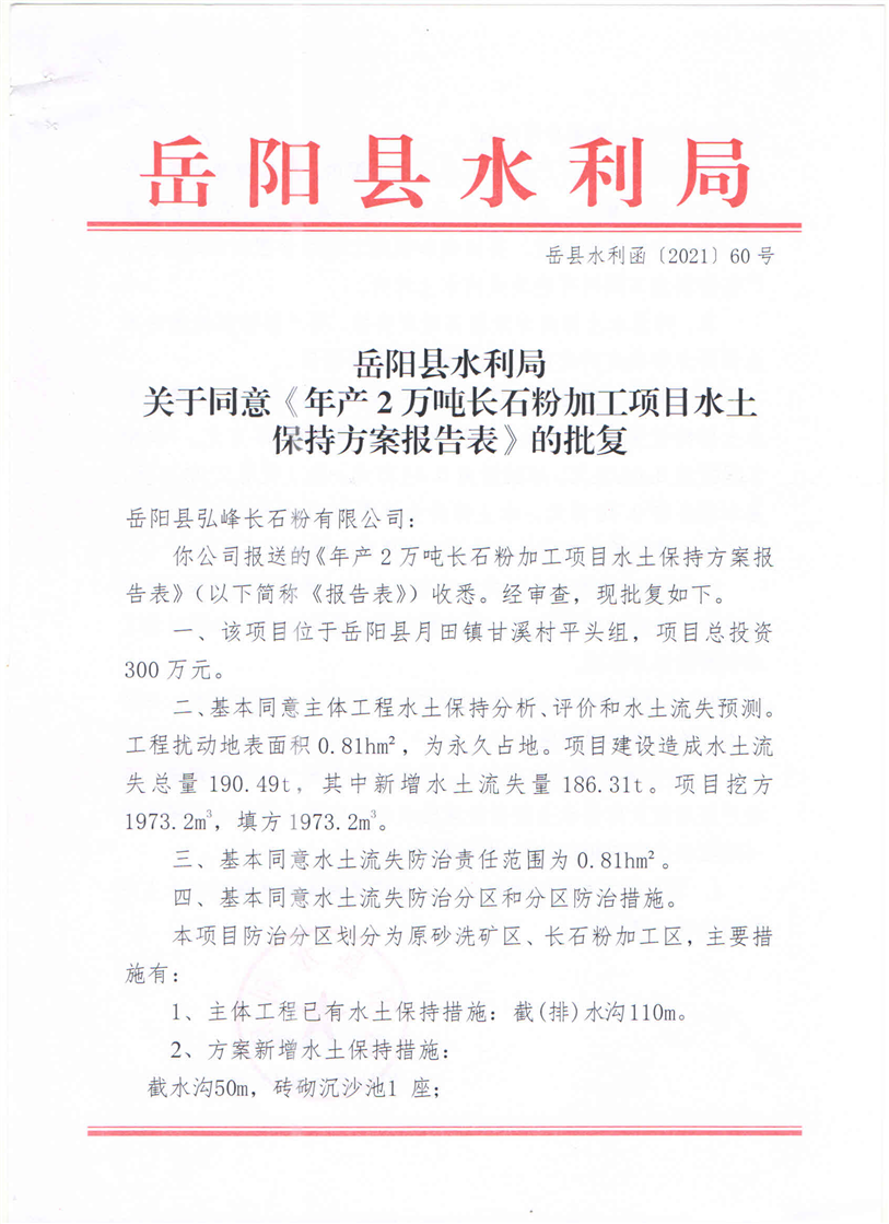 岳阳县水利局关于同意《年产2万吨长石粉加工项目水土保持方案报告表》的批复