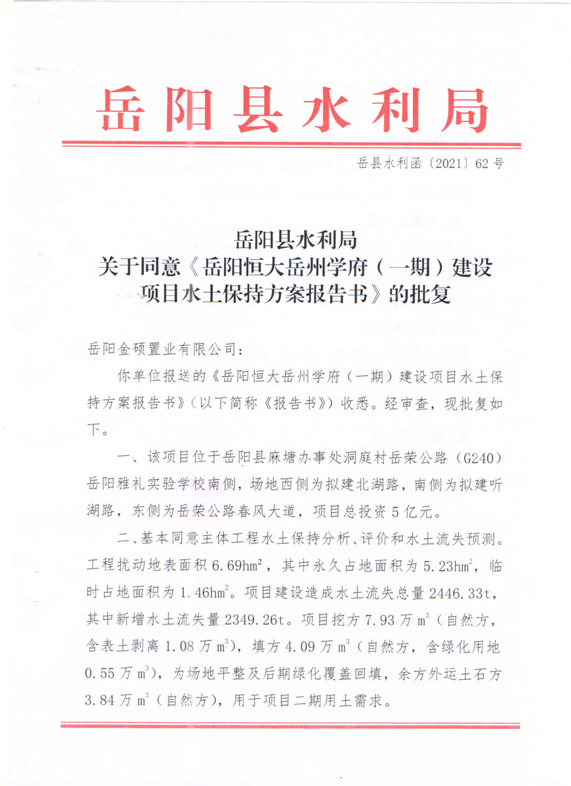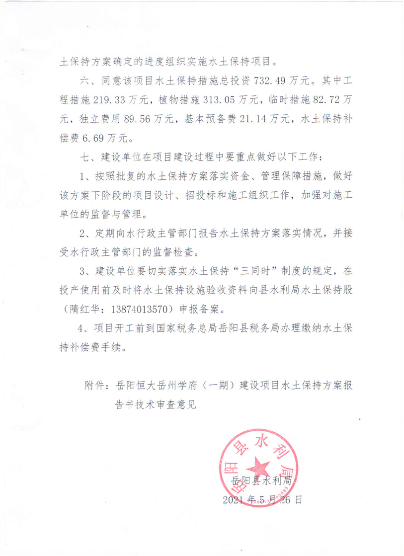 岳阳县水利局关于同意《岳阳恒大岳州学府(一期)建设项目水土保持方案报告书》的批复