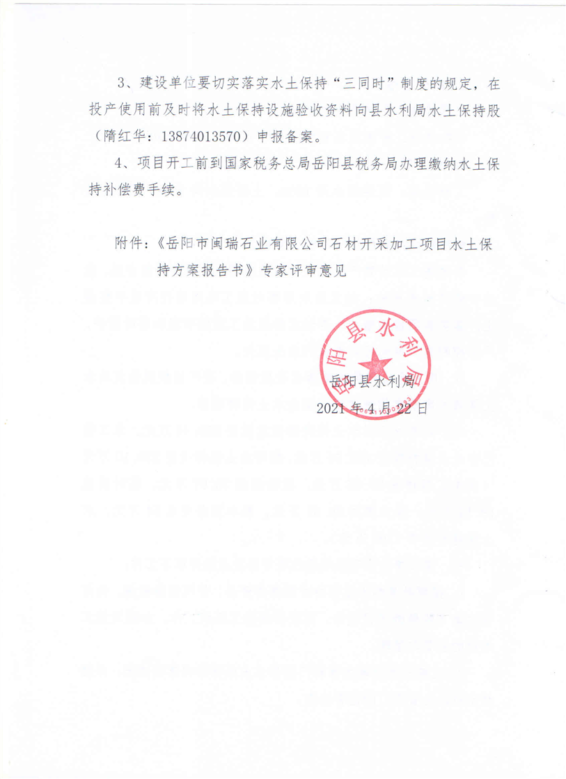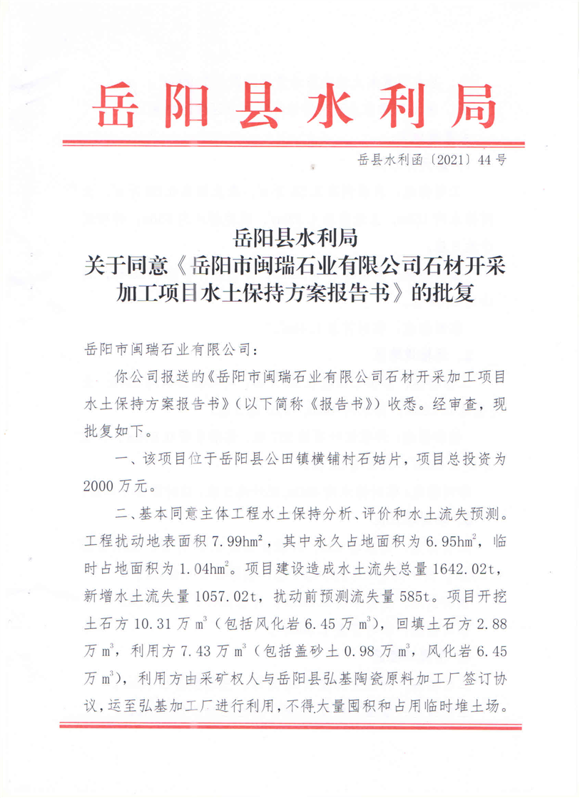 岳阳县水利局关于同意《岳阳市闽瑞石业有限公司石材开采加工项目水土保持方案报告书》的批复