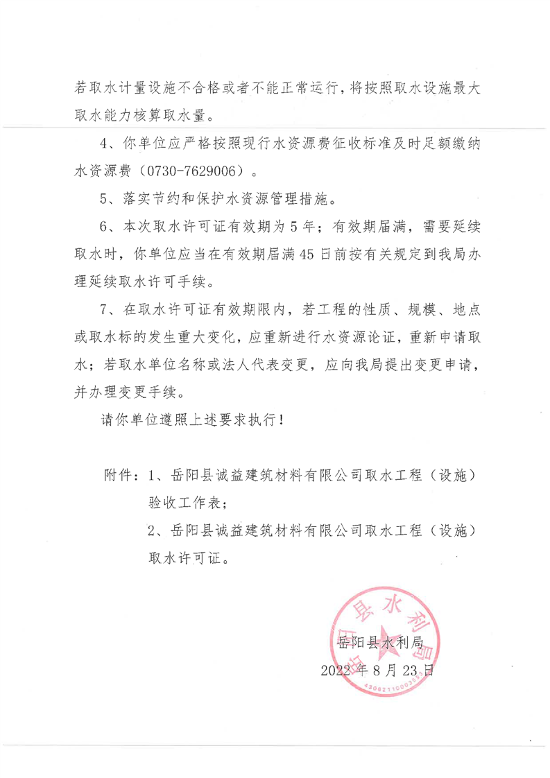 岳阳县水利局关于核发岳阳县诚益建筑材料有限公司取水许可证的通知