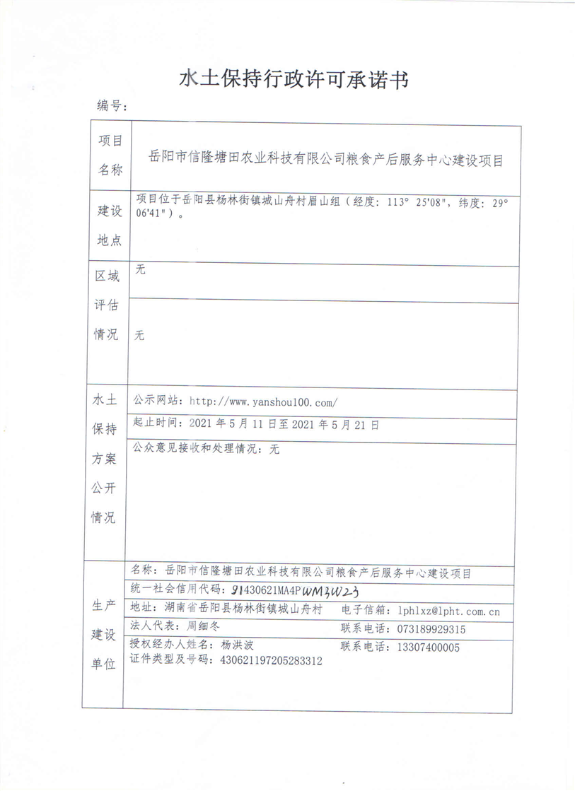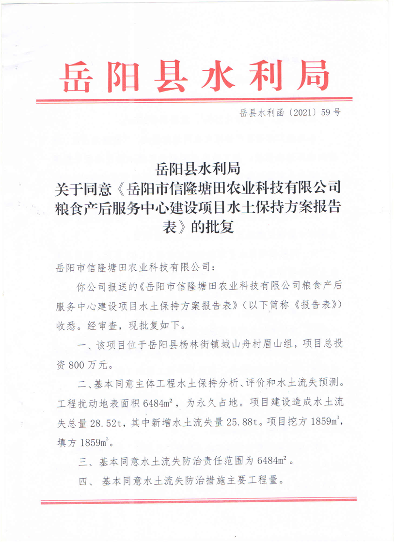 岳阳县水利局关于同意《岳阳市信隆塘田农业科技有限公司粮食产后服务中心建设项目水土保持方案报告表》的批复