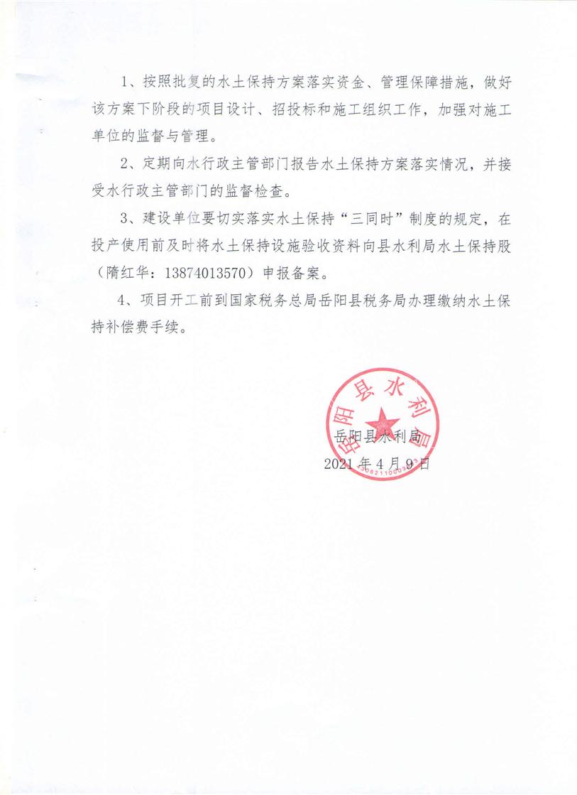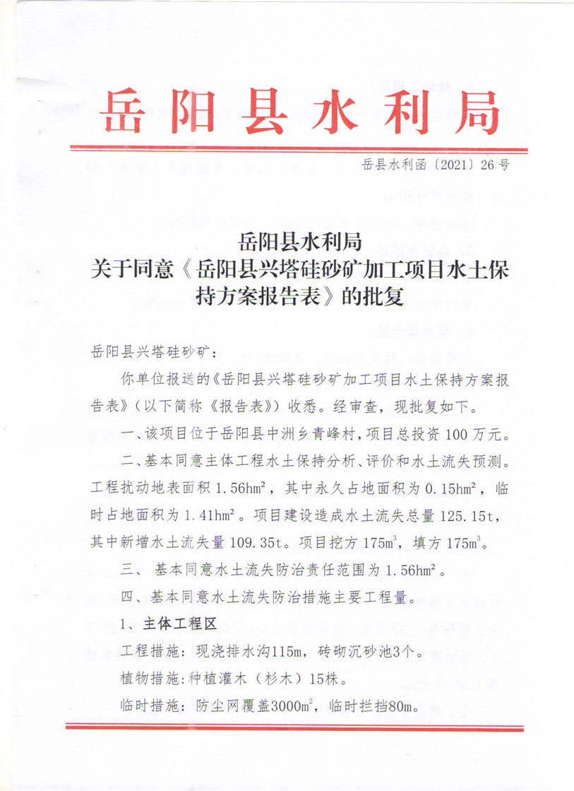 岳阳县水利局关于同意《岳阳县兴塔硅砂矿加工项目水土保持方案报告表》的批复