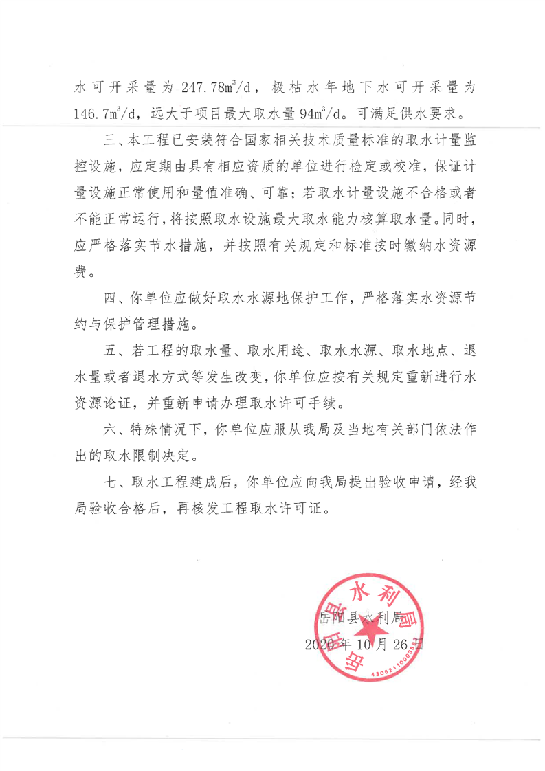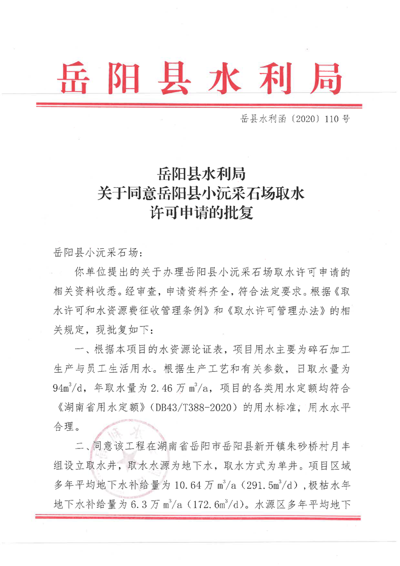 岳阳县水利局关于同意岳阳县小沅采石场取水许可申请的批复