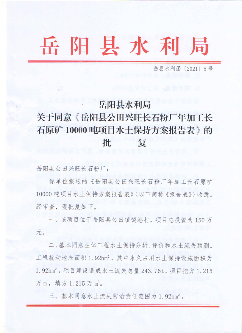岳阳县水利局关于同意《岳阳县公田兴旺长石粉厂年加工长石原矿10000吨项目水土保持方案报告表》的批复