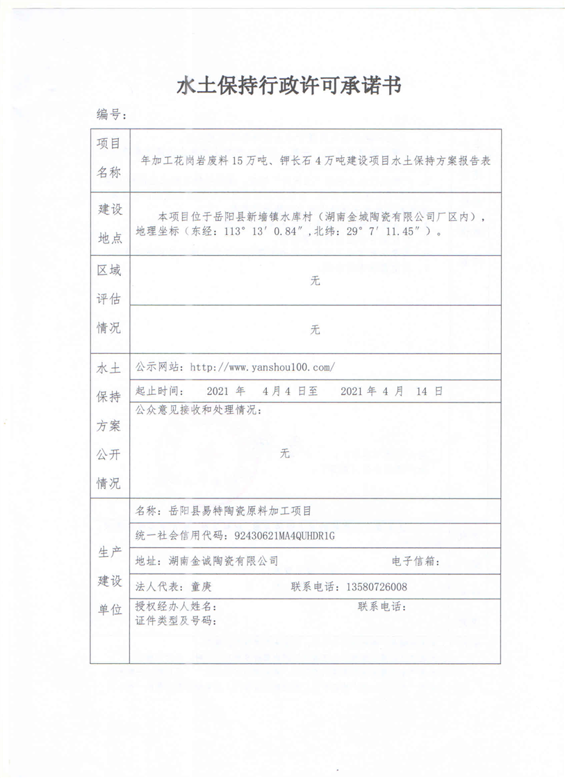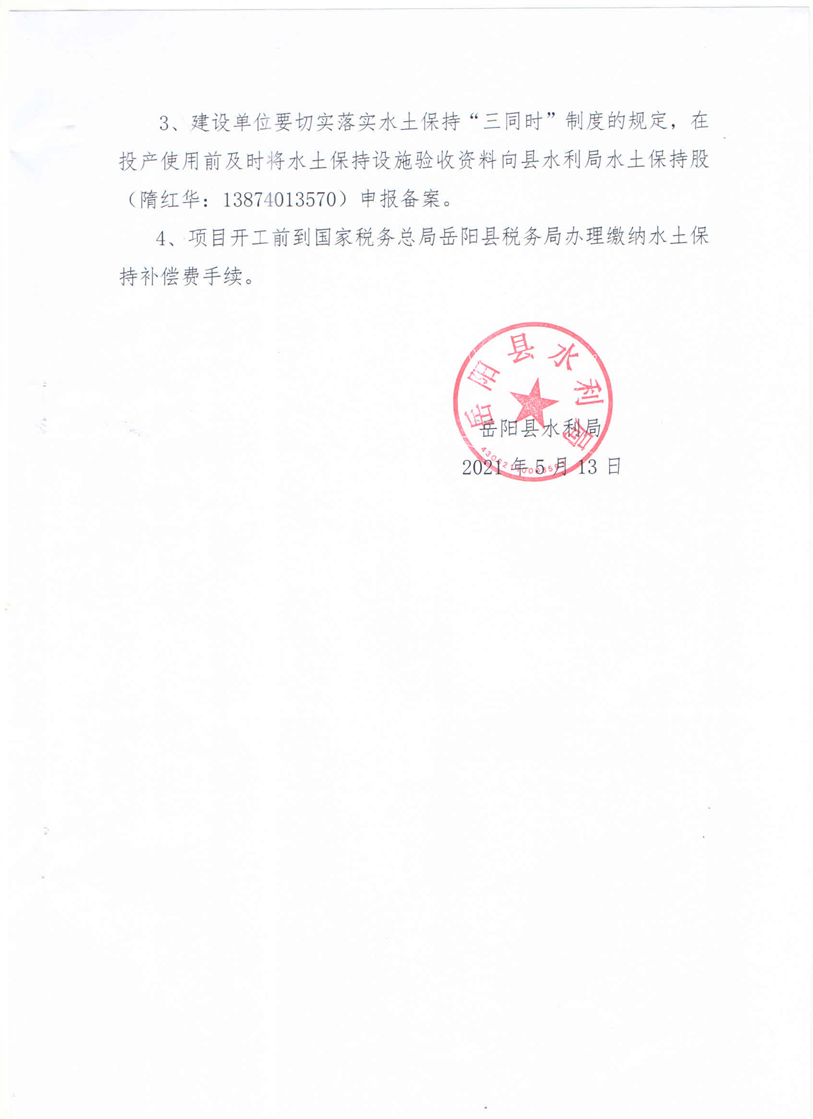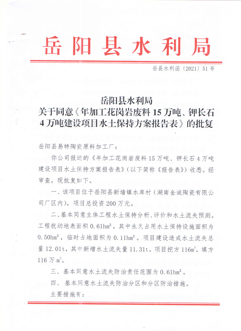 岳阳县水利局关于同意《年加工花岗岩废料15万吨、钾长石4万吨建设项目水土保持方案报告表》的批复