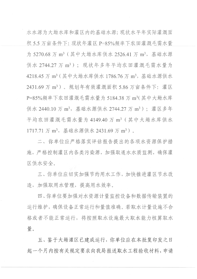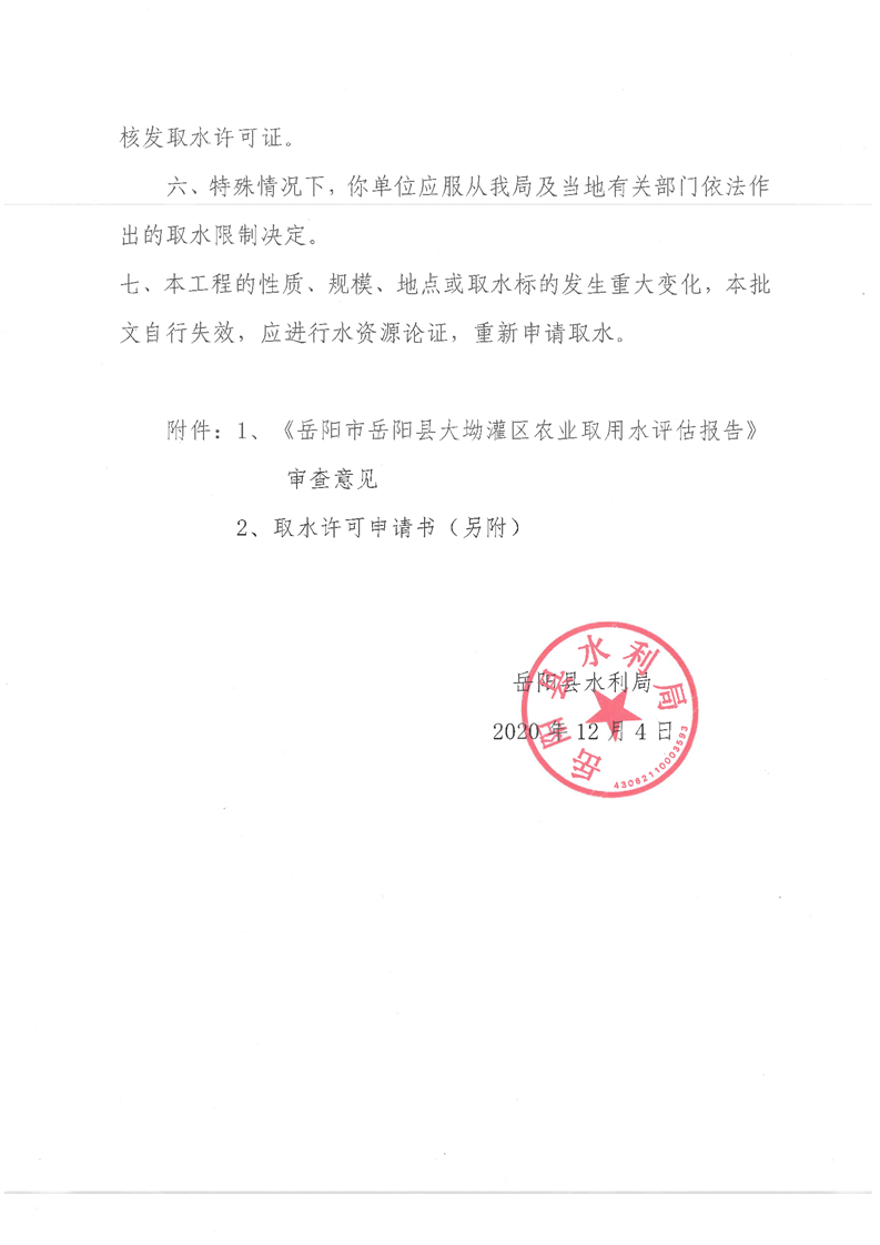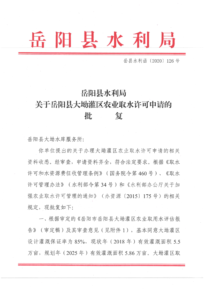 岳阳县水利局关于岳阳县大坳灌区农业取水许可申请的批复