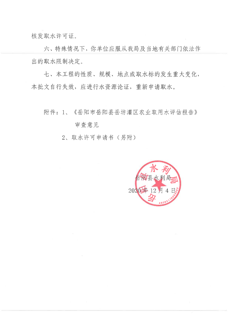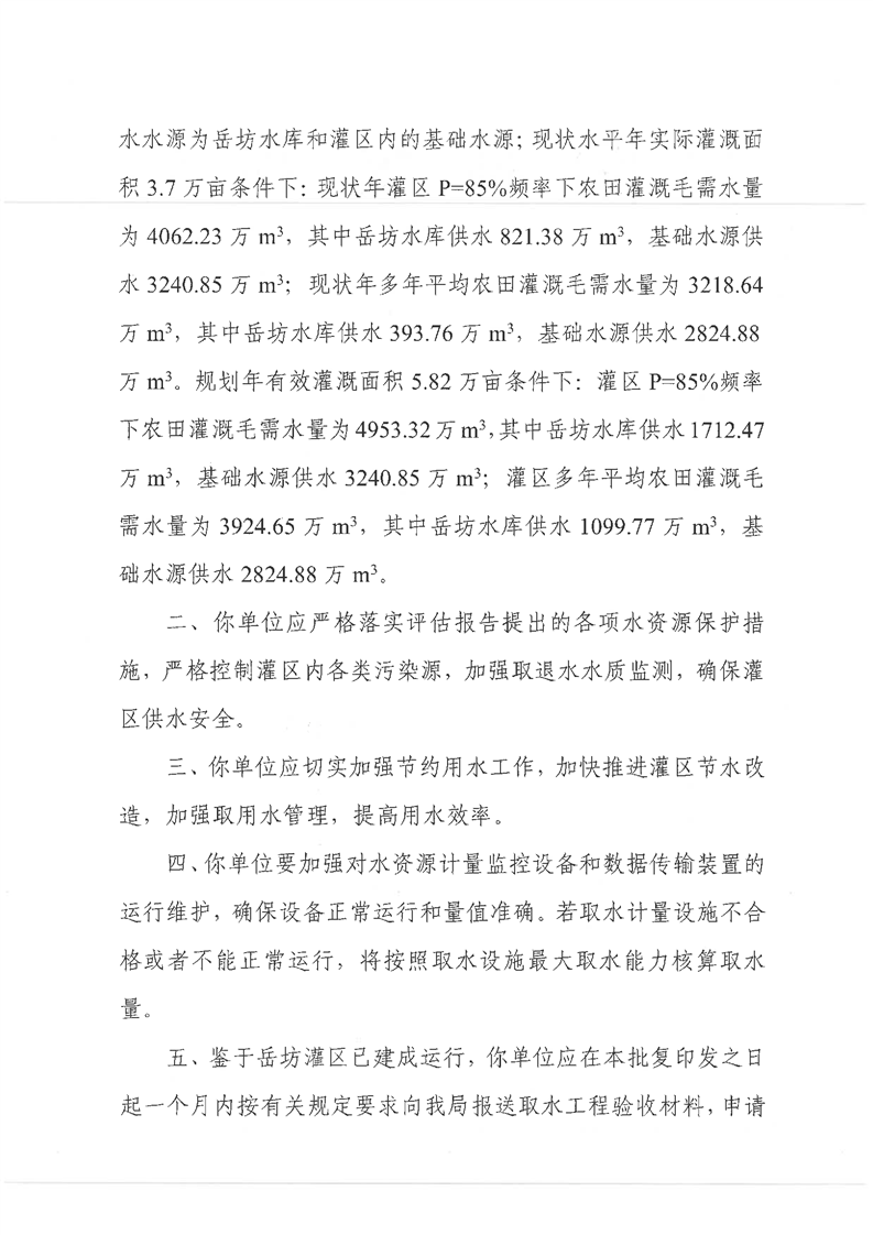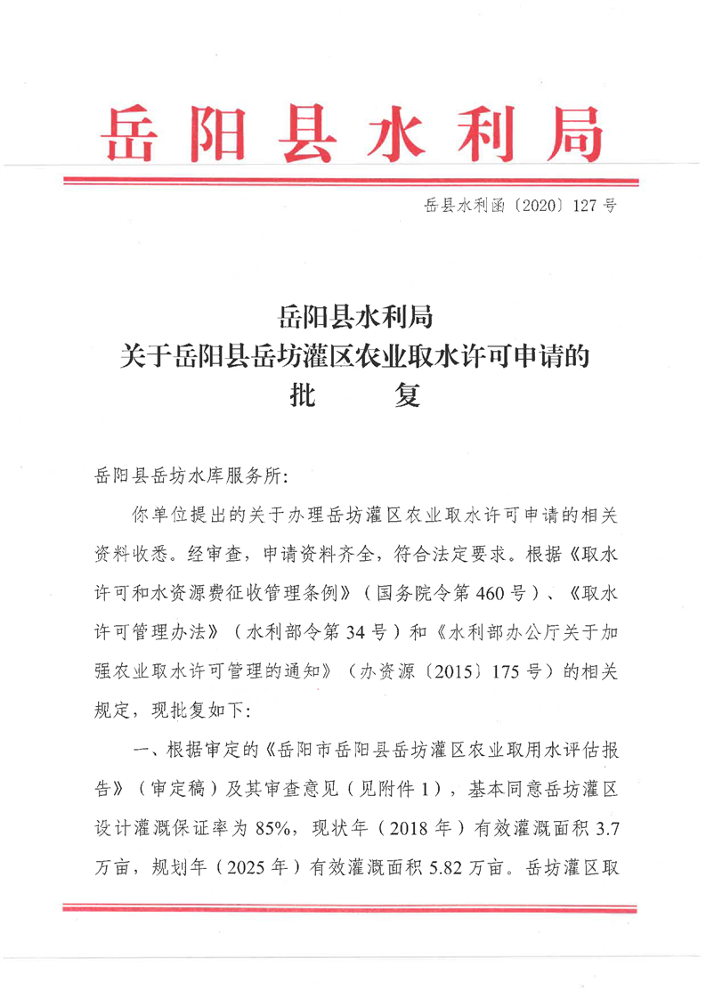 岳阳县水利局关于岳阳县岳坊灌区农业取水许可申请的批复