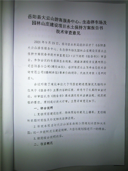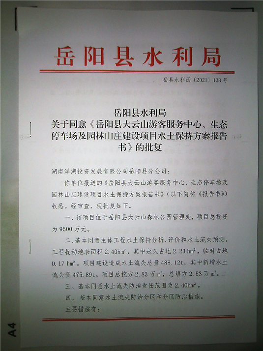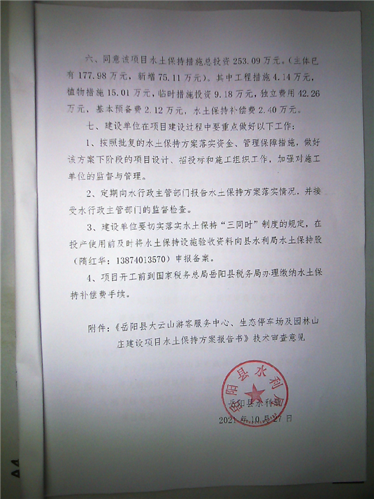 岳阳县水利局关于同意《岳阳县大云山游客服务中心、生态停车场及园林山庄建设项目水土保持方案报告书》的批复