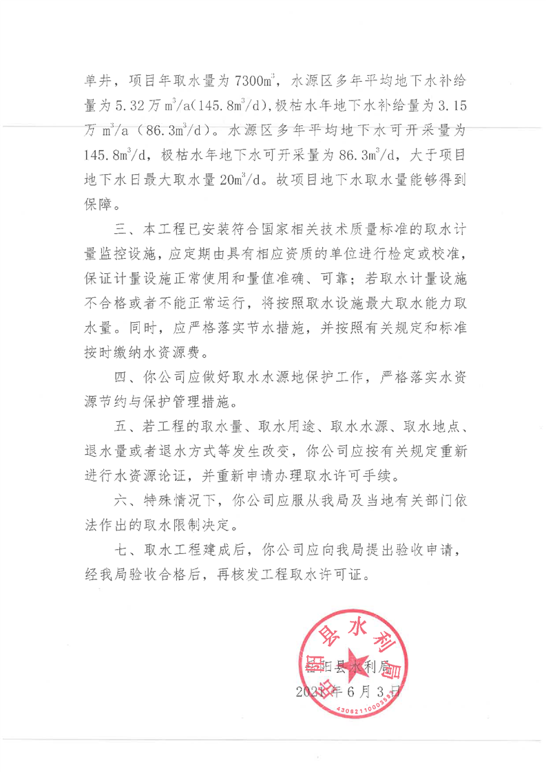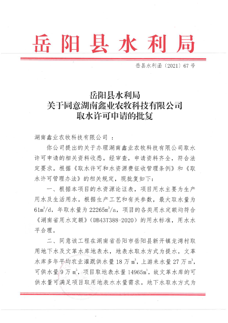 岳阳县水利局关于同意湖南鑫业农牧科技有限公司取水许可申请的批复2