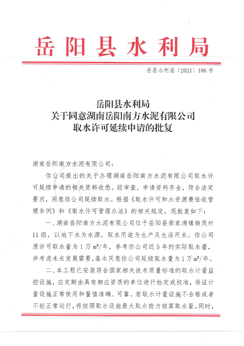 岳阳县水利局关于同意湖南岳阳南方水泥有限公司取水许可延续申请的批复