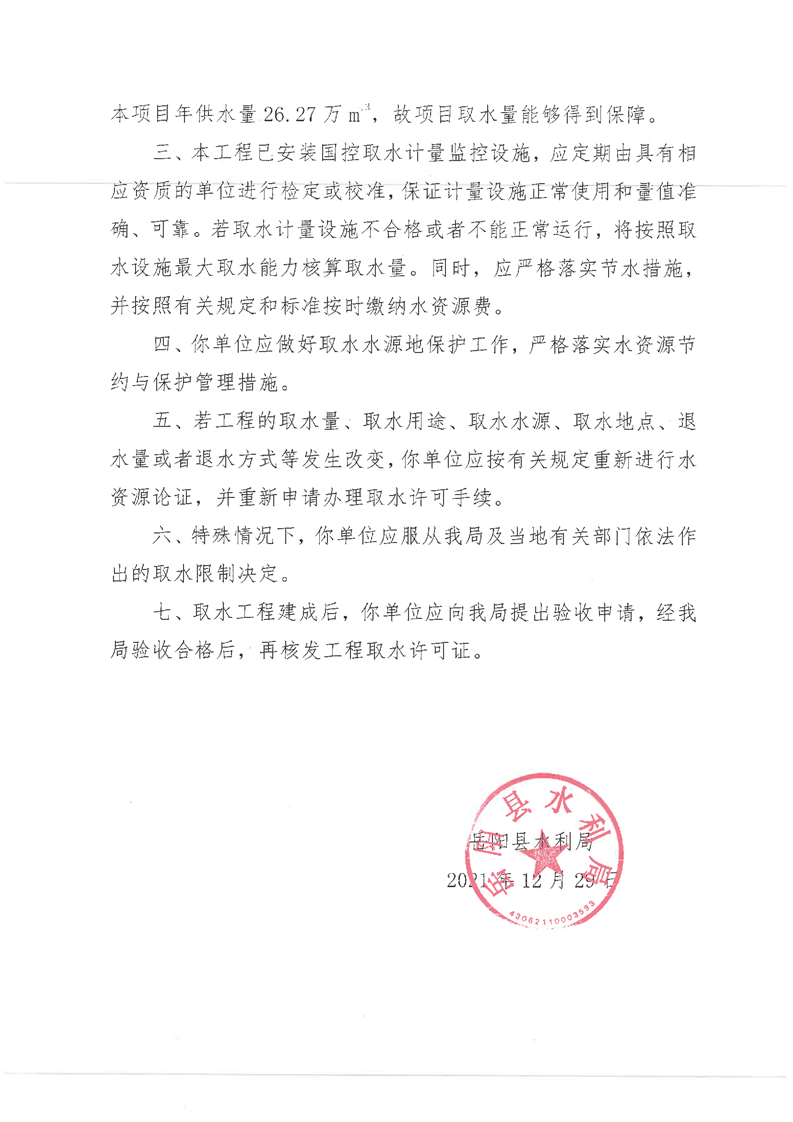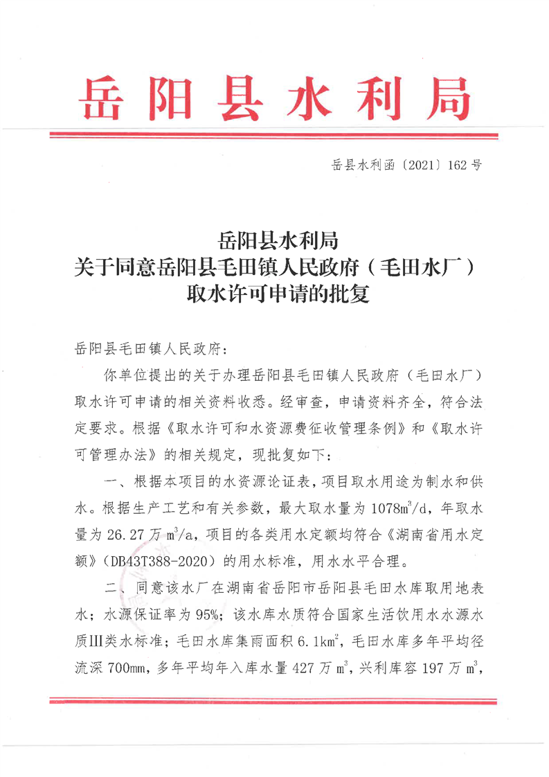 岳阳县水利局关于同意毛田镇人民政府(毛田水厂)取水许可申请的批复
