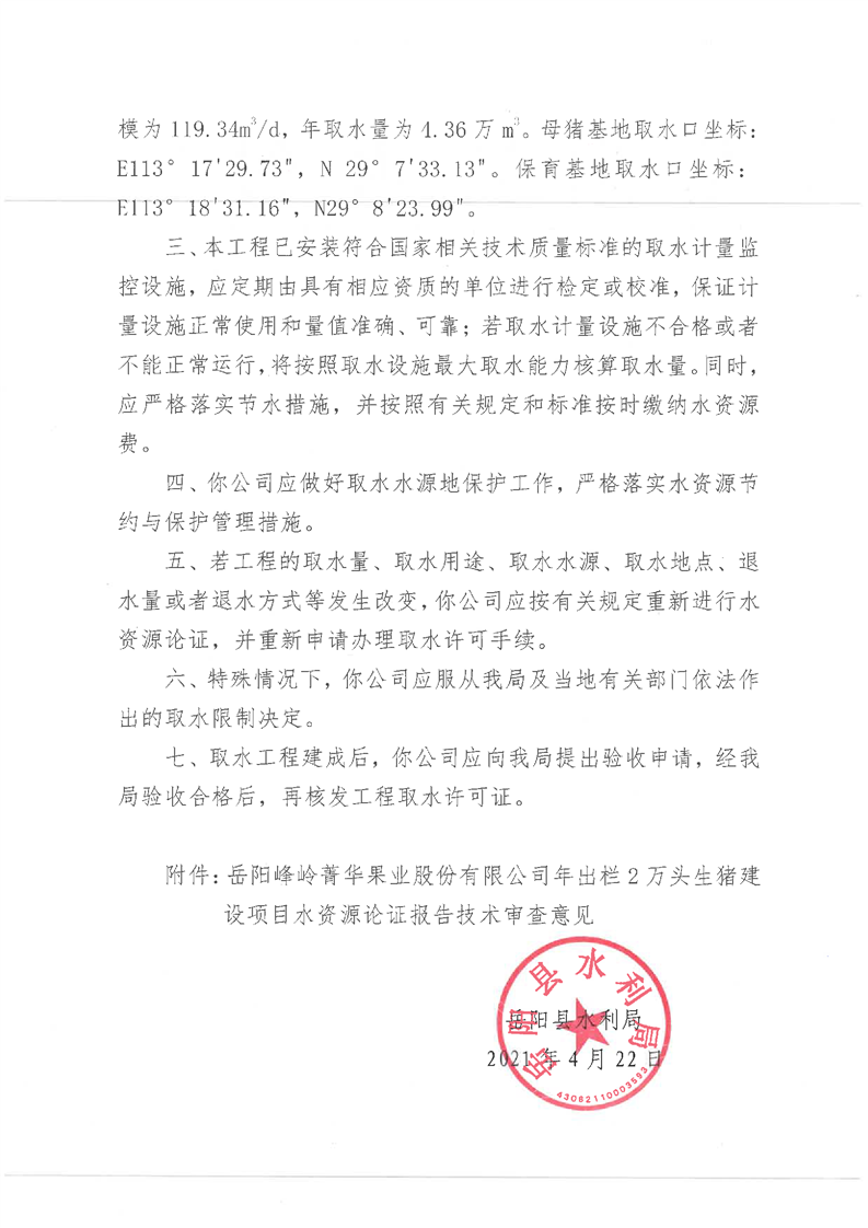 关于同意岳阳峰岭菁华果业股份有限公司年出2万头生猪建设项目取水许可申请的批复