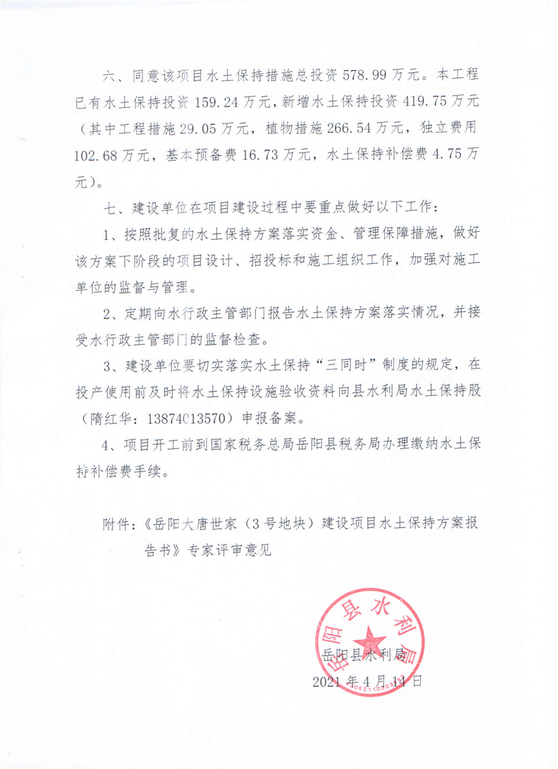 岳阳县水利局关于同意《岳阳大唐世家(3号地块)建设项目水土保持方案报告书》的批复