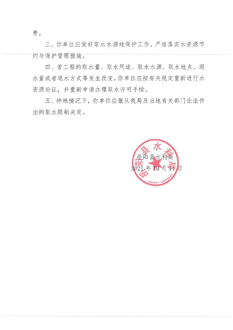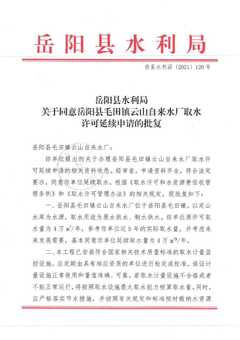 岳阳县水利局关于同意岳阳县毛田镇云山自来水厂取水许可延续申请的批复