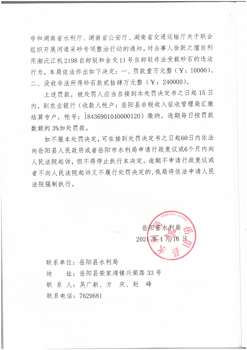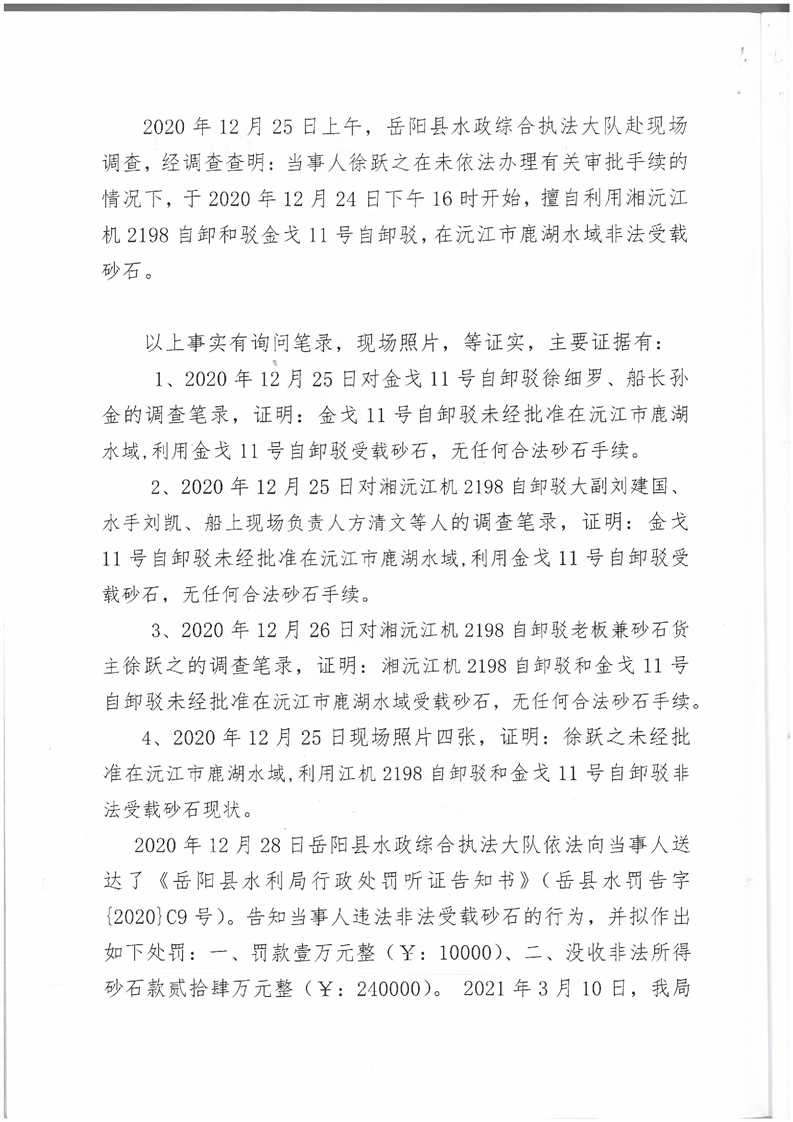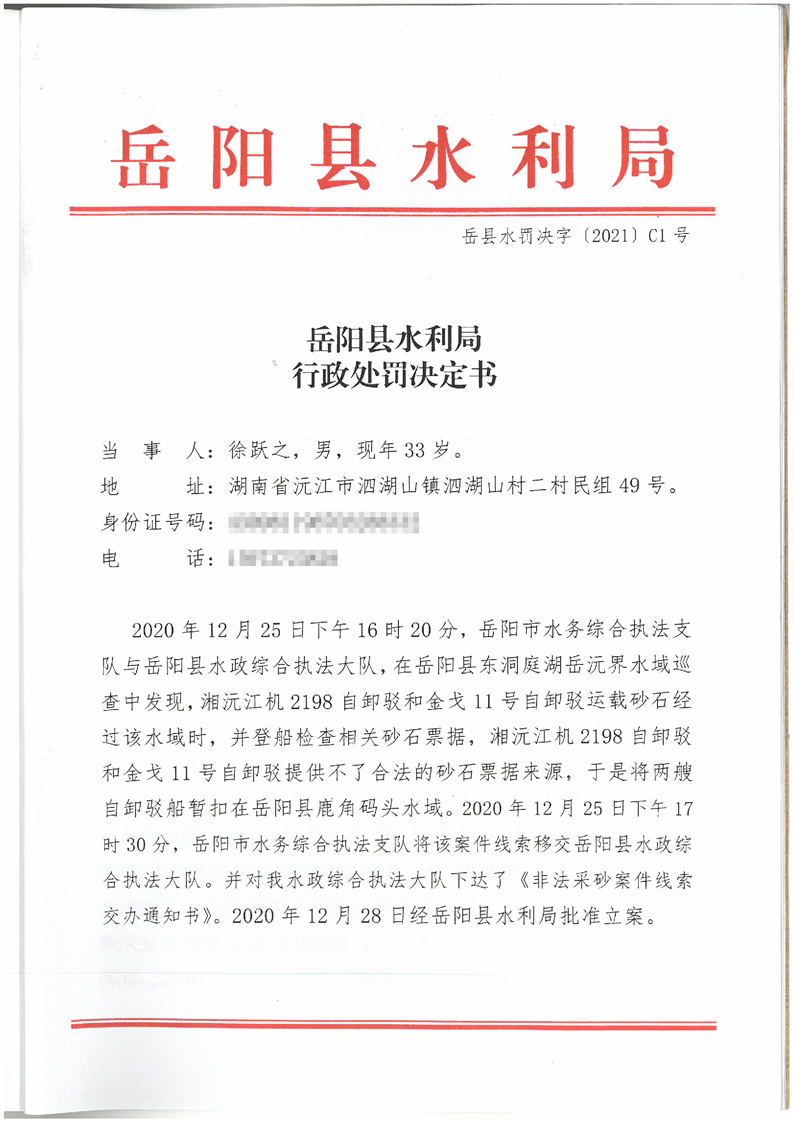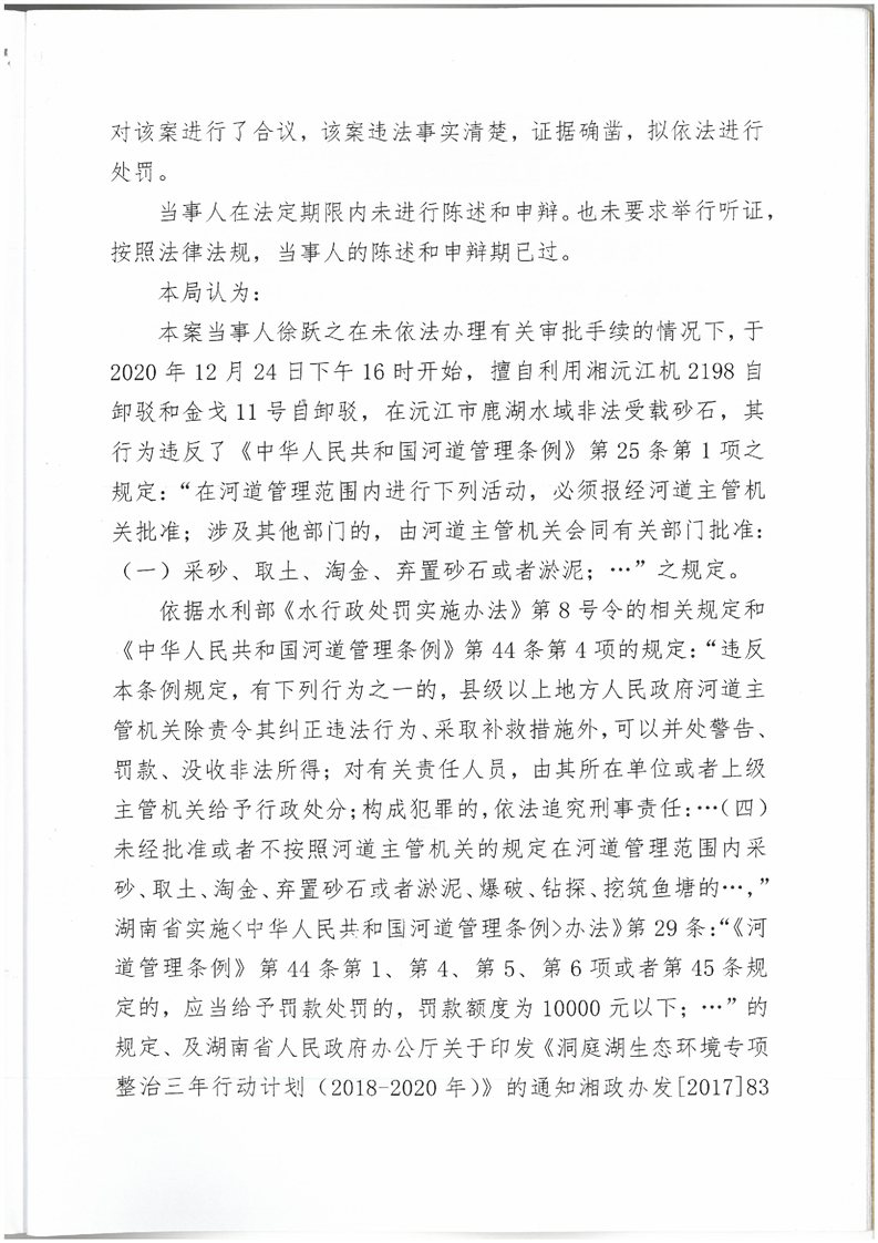 徐跃之在岳阳县东洞庭湖岳沅界水域非法采砂案