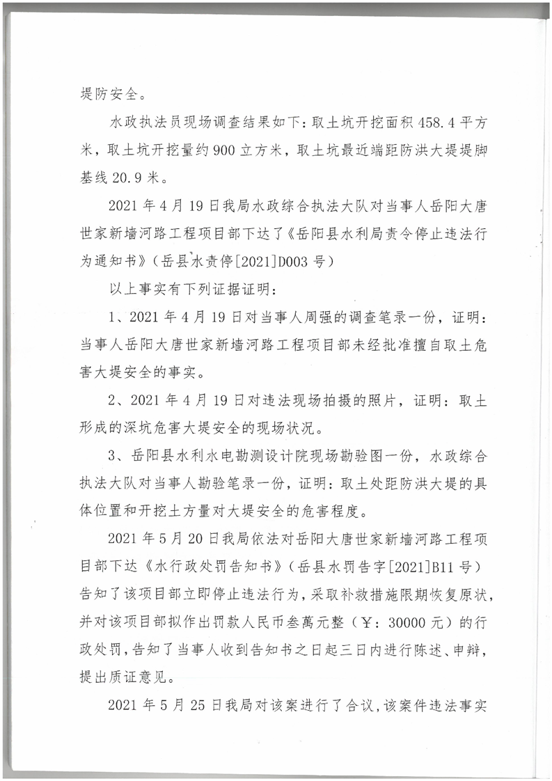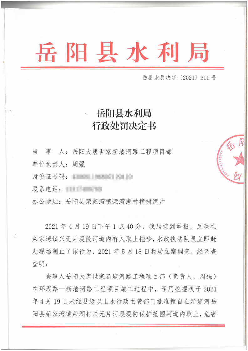 岳阳大唐世家新墙河路工程项目部在新墙河岳阳县荣家湾镇八仙桥上游300米处河道内损坏子堤案