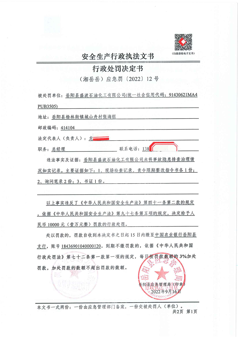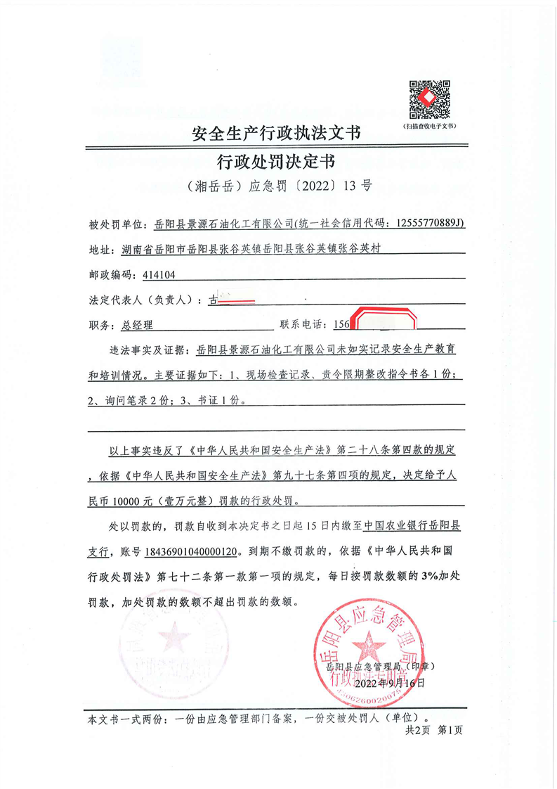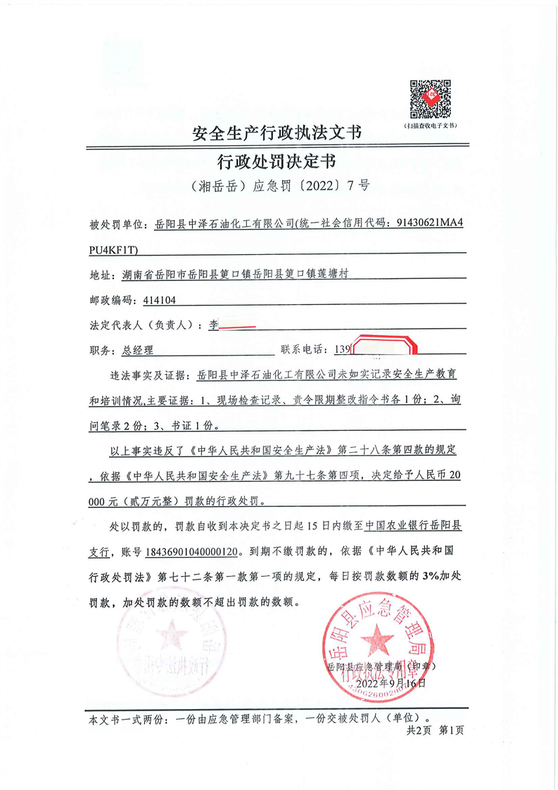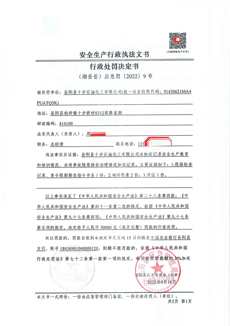 岳阳县应急管理局:安全生产行政处罚决定公示(9月第二批)