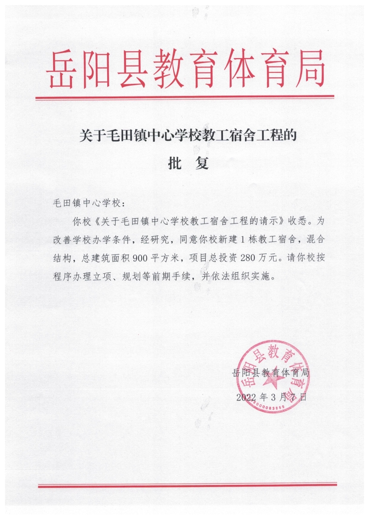 你校《关于毛田镇中心学校教工宿舍工程的请示》收悉。为改善学校办学条件,经研究,同意你校新建1栋教工宿舍,混合结构,总建筑面积900平方米,项目总投资280万元。请你校按程序办理立项、规划等前期手续,并依法组织实施。