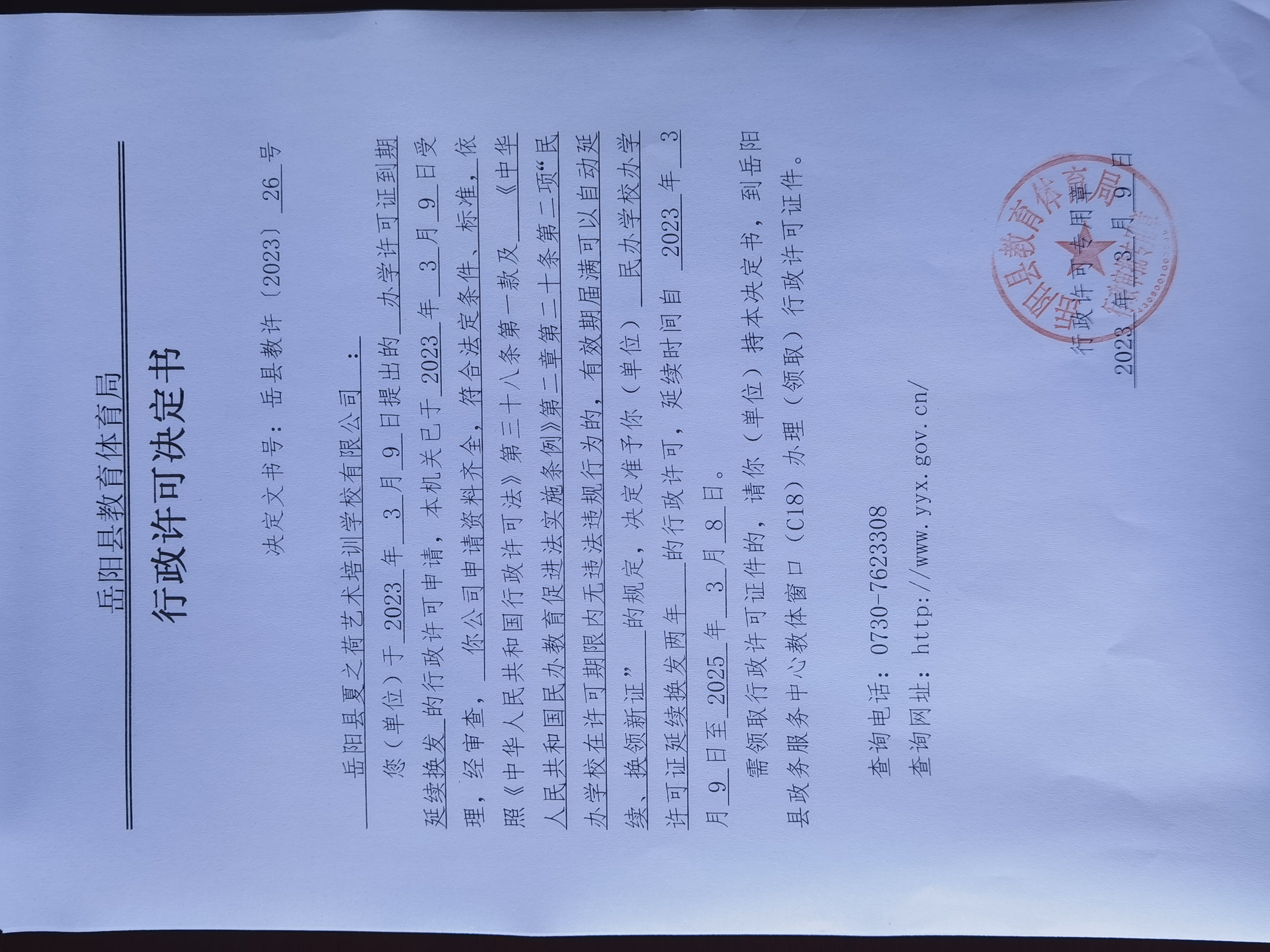 关于准予岳阳县夏之荷艺术培训学校有限公司办学许可证到期延续换发的许可决定