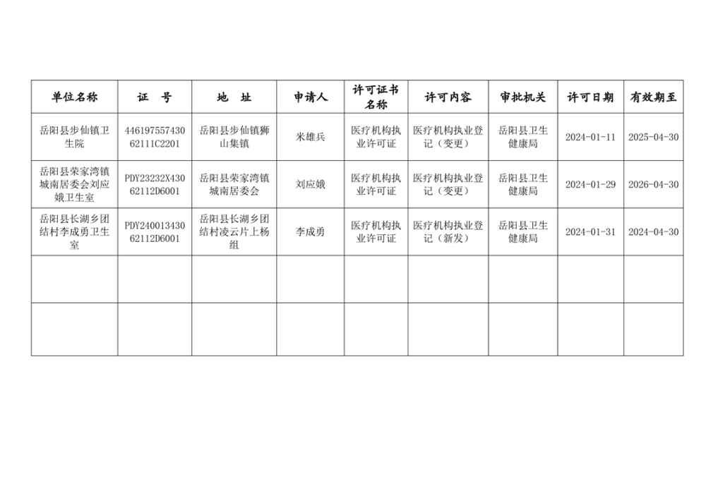 岳阳县卫生健康局2024年1月医疗机构执业许可公示