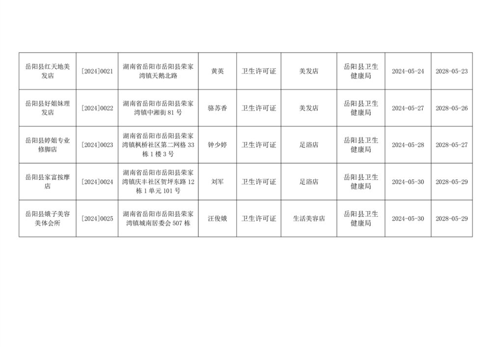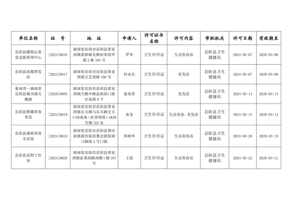 岳阳县卫生健康局2024年5月公共场所卫生许可公示
