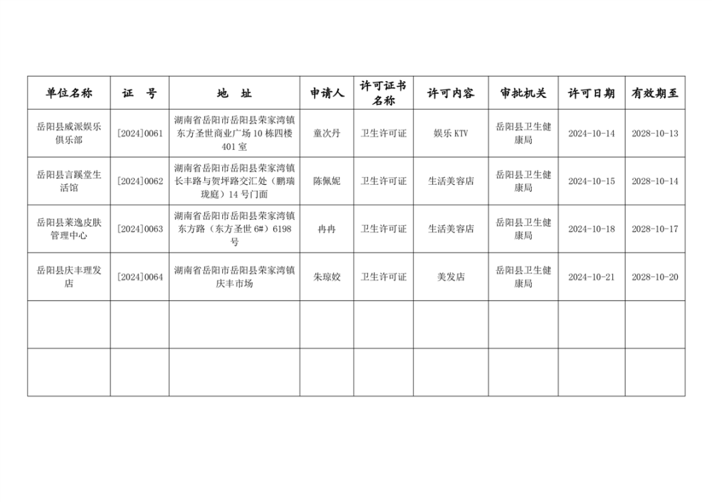 岳阳县卫生健康局2024年10月公共场所卫生许可公示