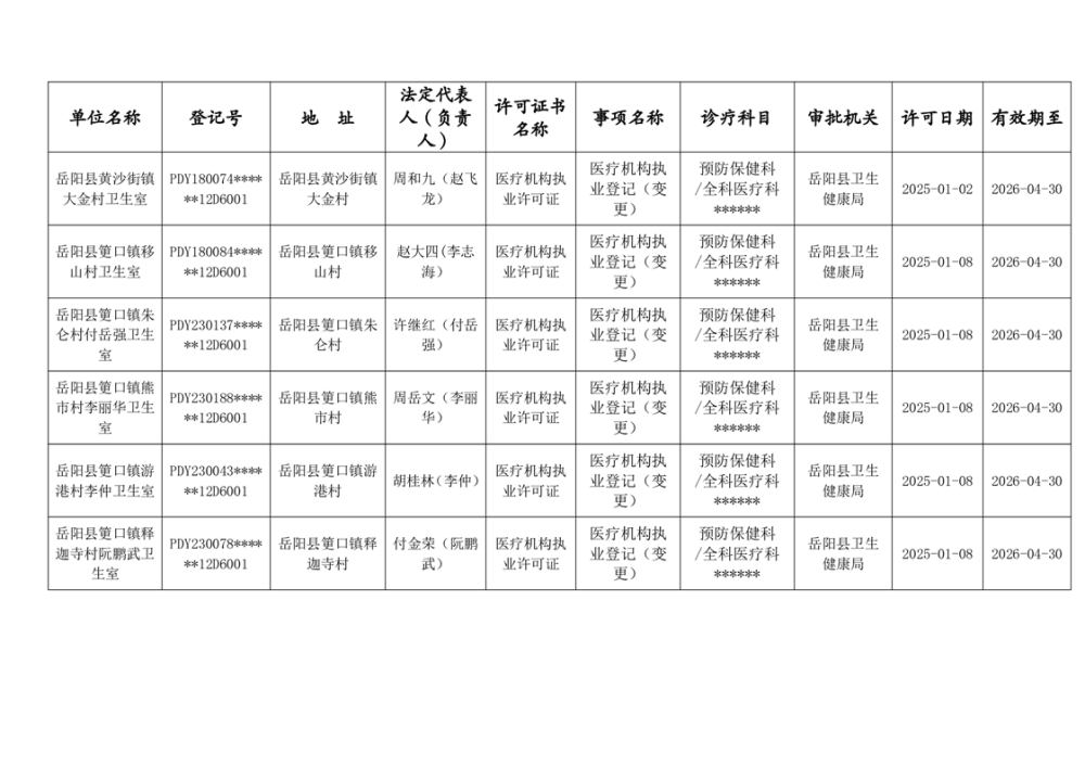 岳阳县卫生健康局2025年1月医疗机构执业许可公示