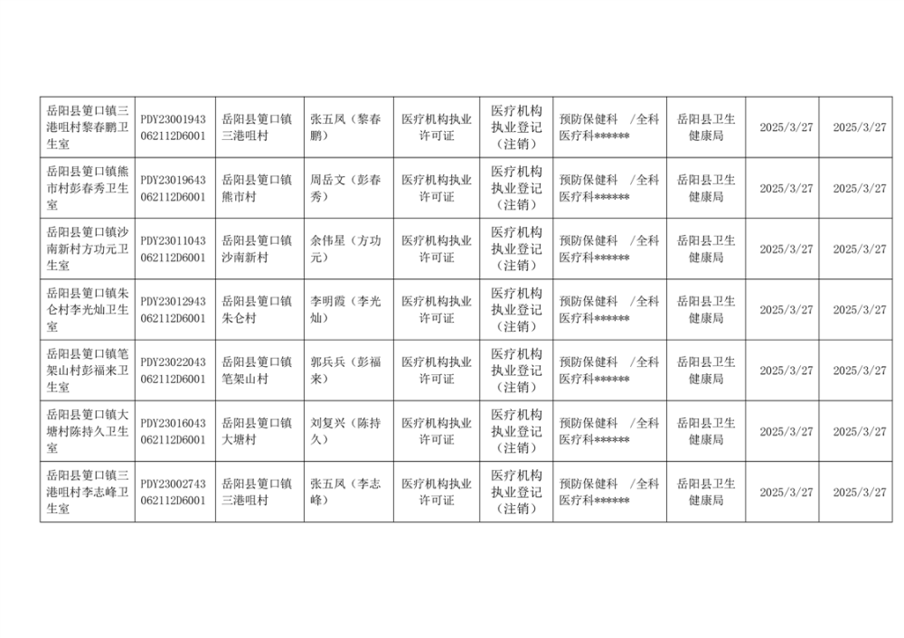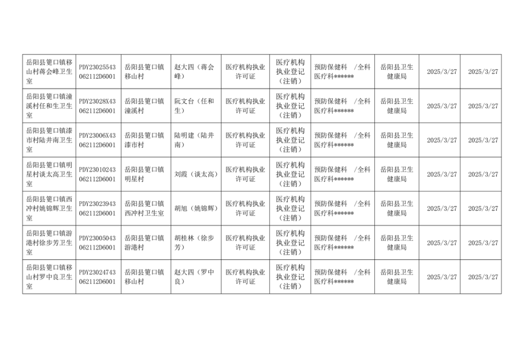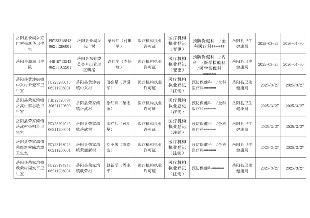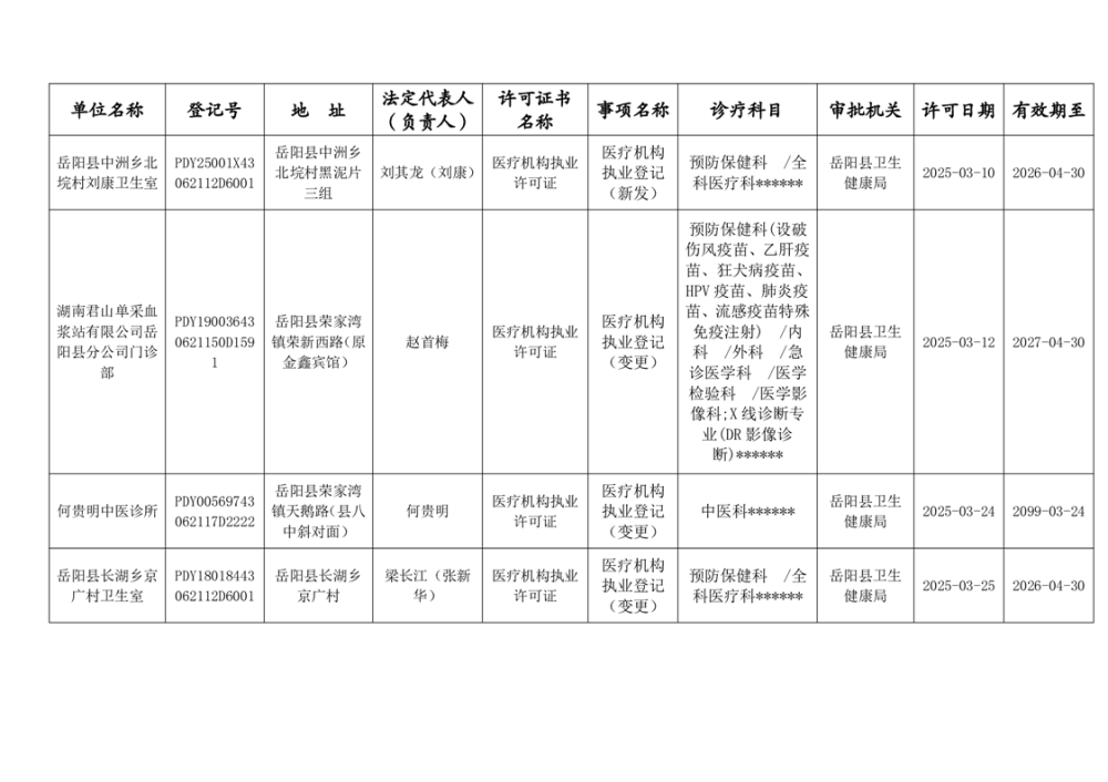 岳阳县卫生健康局2025年3月医疗机构执业许可公示