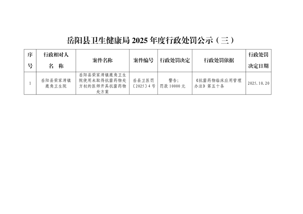 岳阳县卫生健康局2025年度行政处罚公示(三)
