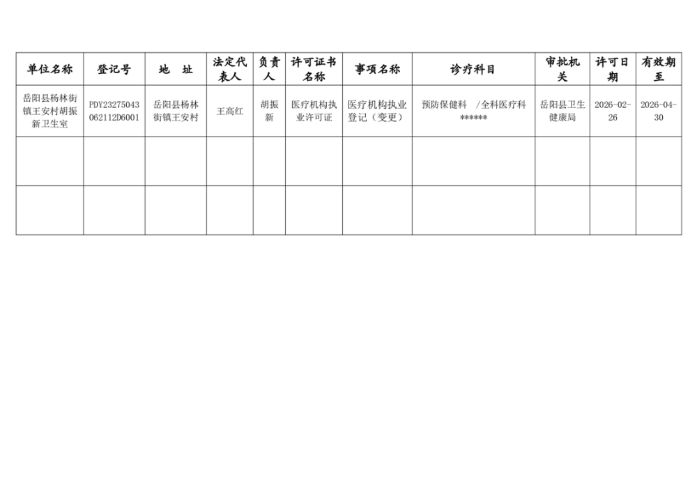 岳阳县卫生健康局2026年2月医疗机构执业许可公示