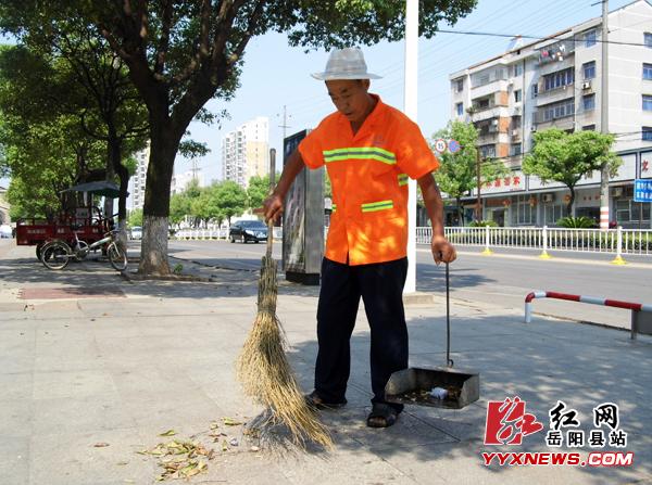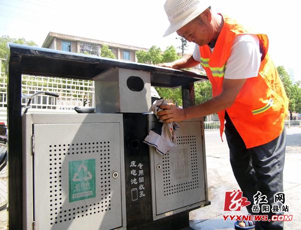 红网岳阳县站8-15讯(本站记者 吴拥民 彭会)8-13上午10时,强烈的光刺得人睁不开眼睛,裸露的皮肤在阳光下被灼得阵阵刺痛。烈下,树荫半遮半漏的的垃圾桶边,一个蹲着的橙色身影正用抹布吃力的擦拭着桶身的污垢,黝黑的脸上布满了密密的汗珠。眼看着刚奋力擦过的一边桶身渐渐露出了它本来的光洁容貌,李振龙满意的笑了笑,将清洗球上的污渍在身边水桶中搓洗干净后,蘸上些袋中的洗衣粉,又擦上了另一边。