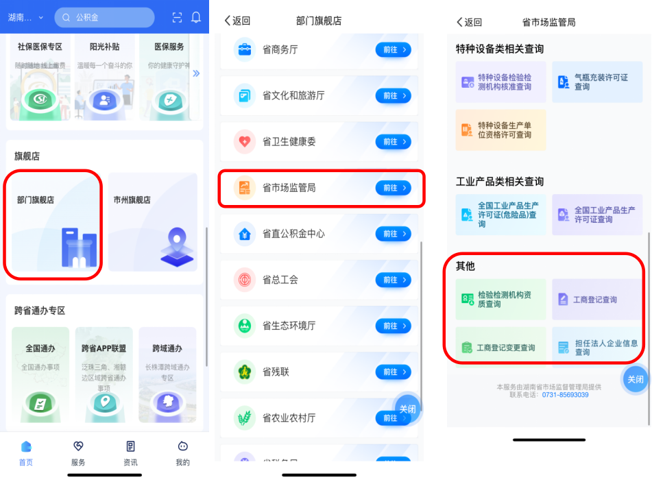 登陆“湘易办”后,在首页“部门旗舰店”中选择“省市场监督管理局”,在“其他”栏目中点击对应服务名称即可进入;或在首页直接搜索相应服务名称进入。