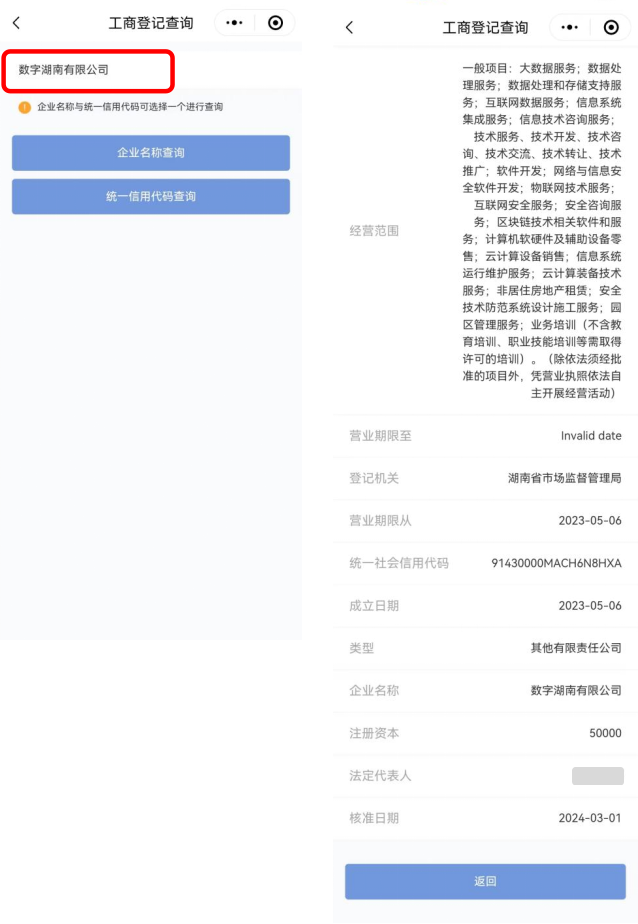 选择“工商登记查询”服务,输入企业名称或企业统一信用代码,即可查询企业与个体工商户的登记信息,包括企业经营范围、营业期限、成立时间、注册资本、法定代表人等。温馨提示:输入企业名称时,需要输入企业注册的全称。