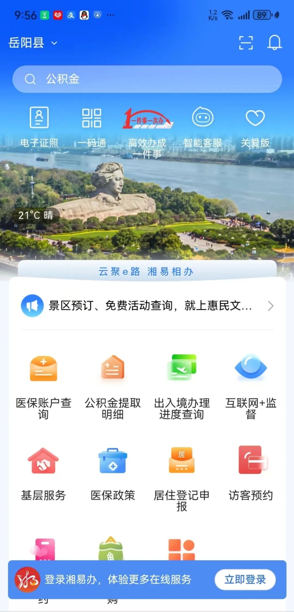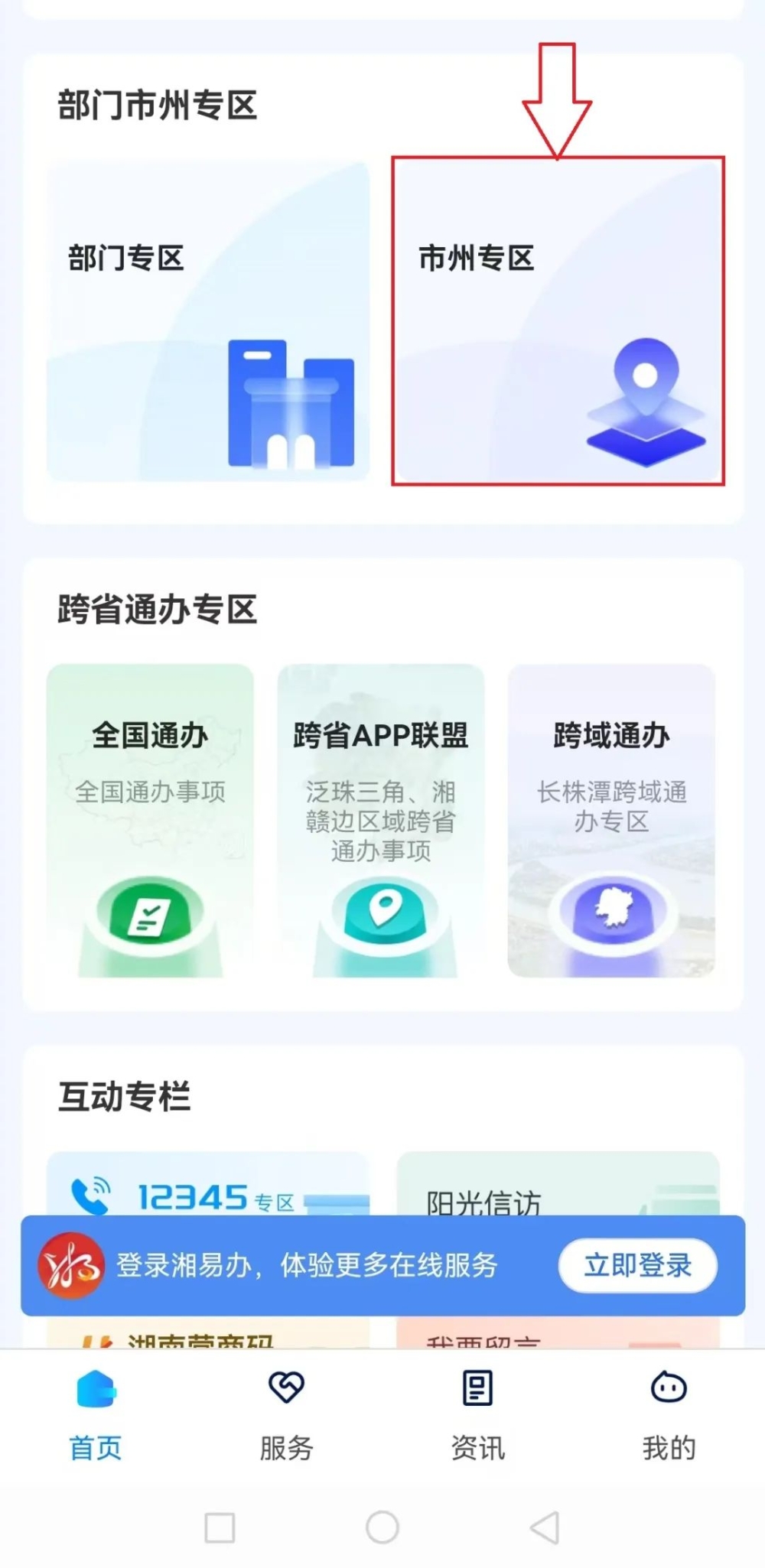 进入APP界面后,向下滑动,点击“市州专区”→选择岳阳市→点击”前往”