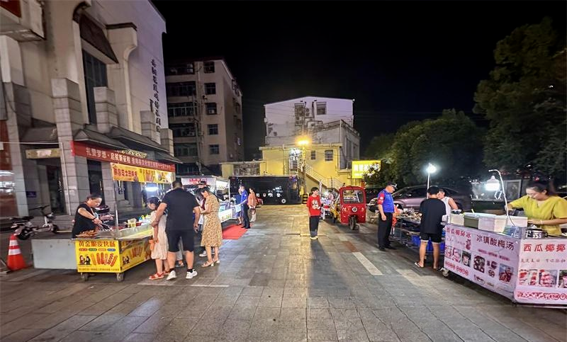 在花鼓戏传承剧院前,县城管局工作人员正在向夜市摊主宣传夜市经营相关管理办法,叮嘱摊主做好经营区卫生管理,随后,摊主在工作人员的指导下,签署了“三包”协议。为加强城区流动摊贩、夜市经营规范管理,今年来,县城管局对流动摊贩、夜市夜宵经营门店进行“划行归市”,在城区划定了9片“规范经营区”,并制定统一标准,规范管理。在保障经营者安全,不占用盲道、消防通道,不侵害他人利益等前提下,鼓励流动摊贩、夜市夜宵经营门店在指定区域的可经营时间内贩卖经营。