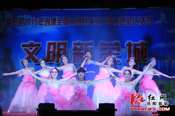 红网岳阳县站10-28讯(分站记者 谌良柱)“我带着孙子来荣湾湖广场玩,碰巧遇上了这场演出,搞得蛮好呢!希望今后还有更多这样精彩的演出。”家住粤西社区的刘娭毑一脸幸福的告诉笔者。10-27晚,由县委宣传部、城关镇政府、县文广新局共同举办的“文明新荣城”2015创建全国文明县城文艺宣传进社区首场演出在荣湾湖广场举行,精彩的演出为在场的群众献上了一场视听的饕餮盛宴。