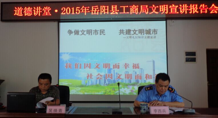 为广泛深入宣传公民道德、文明礼仪和文明城市创建知识,8-28下午,在县工商局七楼会议室,组织开展了“道德讲堂”进机关文明宣讲会,县工商局全体人员、城关一、二、三所、东洞庭湖所全体人员及各农村所所长、县工商局机关院内住户参加了此次宣讲活动。