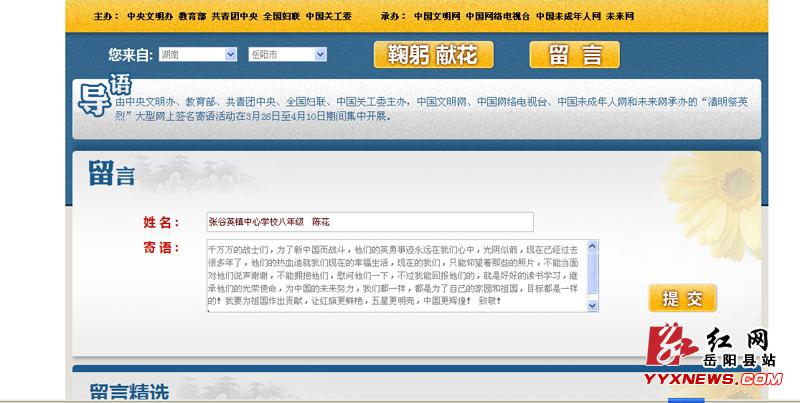 三、网上祭英烈活动。在广泛组织未成-人开展实地祭奠先烈活动的同时,各学校还纷纷组织学生登陆中国文明网进行“网上祭英烈”活动,通过在专题网站上向先贤先烈鞠躬献花、抒写感言寄语,表达广大青少-学生对英烈的感恩和敬仰之情。据统计,清明节期间,全县共有3万余学生参与了“网上祭英烈”活动。