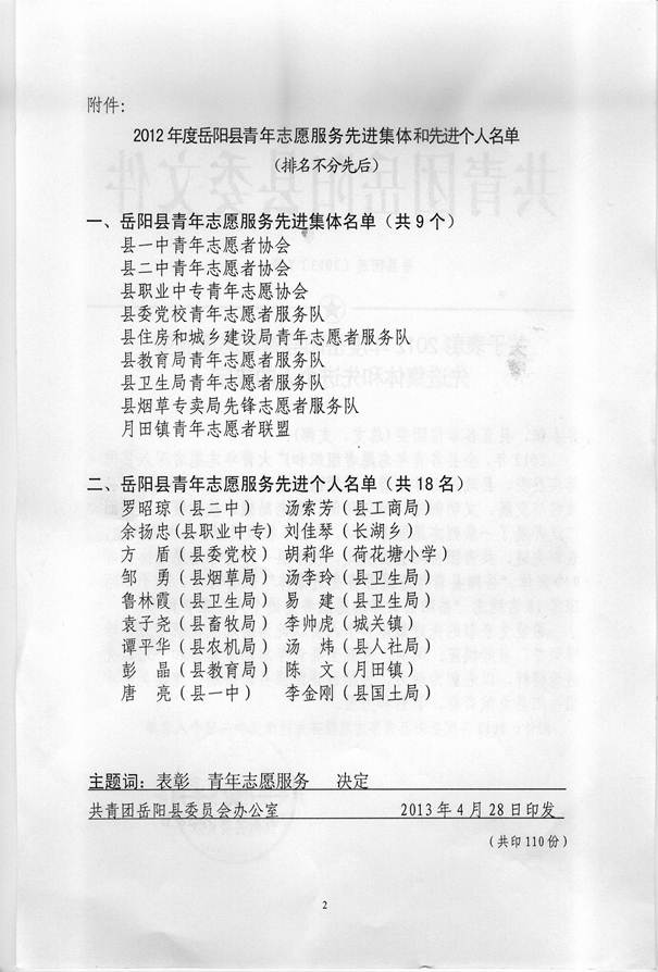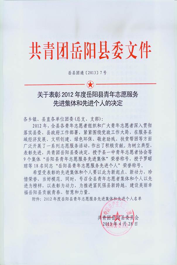 关于表彰2012年度岳阳县青年志愿服务先进集体和先进个人的决定