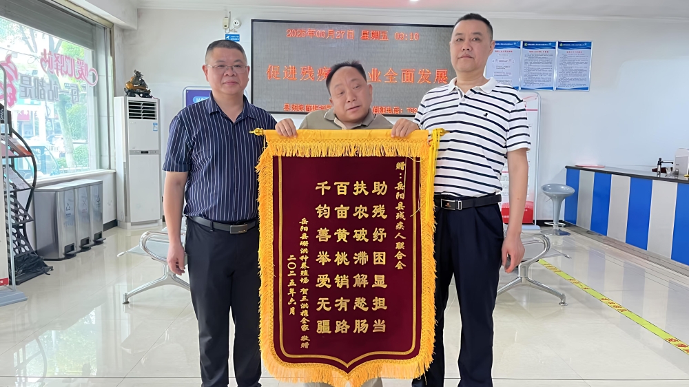 “助残抒困显担当,扶农破滞解愁肠。百亩黄桃销有路,千钧善举爱无疆。”——一面鲜红的锦旗被残障果农贺三洪紧紧攥在手中,锦旗上的烫金大字映着他湿润的眼眶,随锦旗一同送来的,还有一封情真意切的感谢信。在岳阳县残联办证大厅里,贺三洪正与残联党组书记、理事长刘其波分享着黄桃销售破滞的喜悦,工作人员递上的热茶氤氲着热气,正如这一场爱心接力传递的温度。