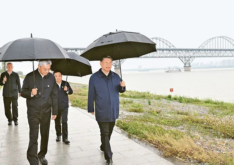 2023年10月10日至13日,中共中央总书记、国家主席、中央军委主席习近平在江西考察。这是10日下午,习近平在长江国家文化公园九江城区段考察时,冒雨沿江堤步行察看沿岸风貌。新华社记者 谢环驰/摄